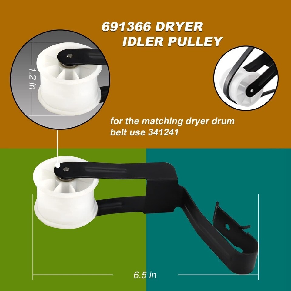 1 PC 691366 Dryer Idler Pulley Assembly: Essential for maintaining tension on the dryer drum belt. Our improved design replaces older Teflon friction idler pulleys for enhanced durability.