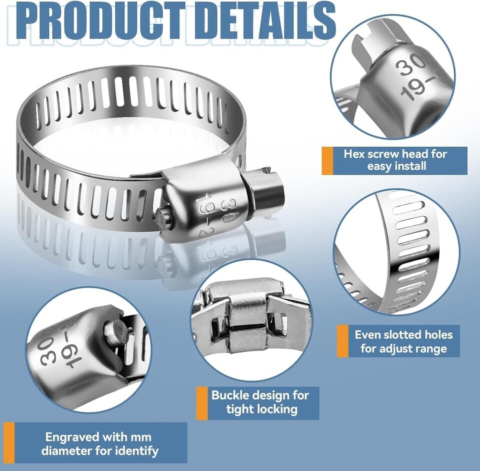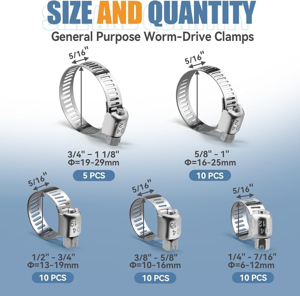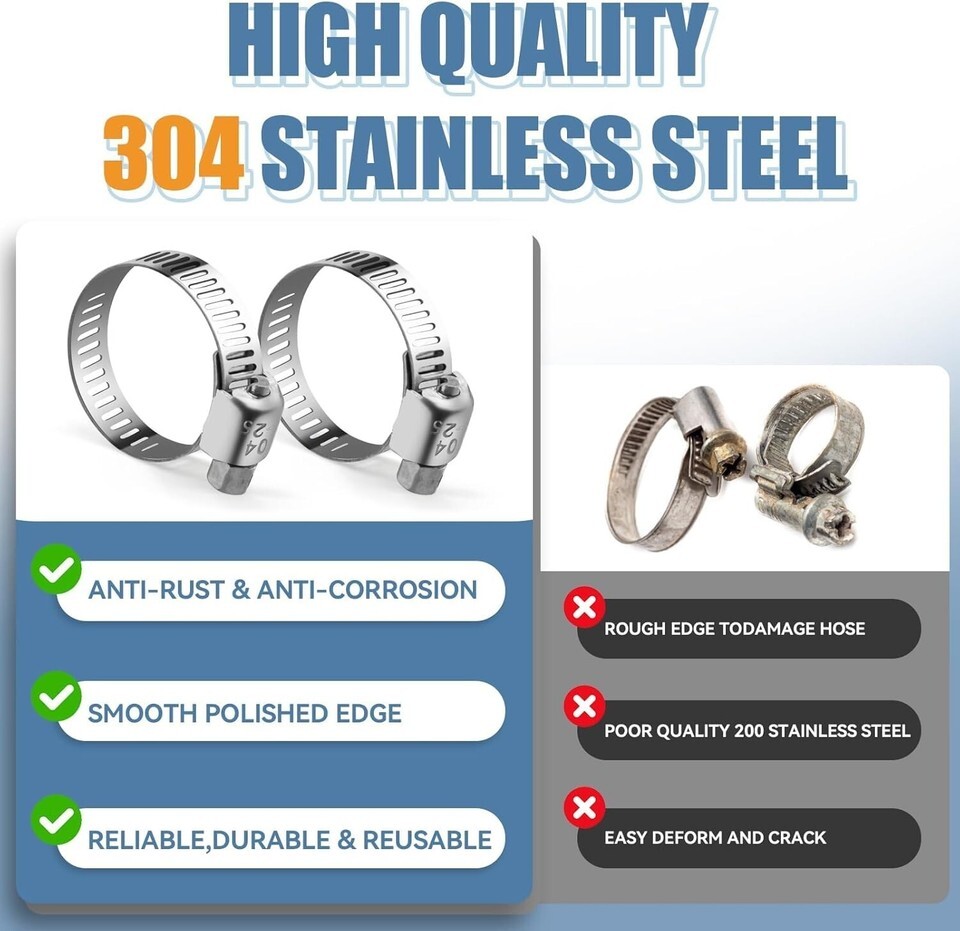 Adjustable Size and Flexibility: This set includes hose clamps adjustable from 1/4'' to 1-1/8'' (6-29mm), providing you with a flexible assortment to accommodate various needs.