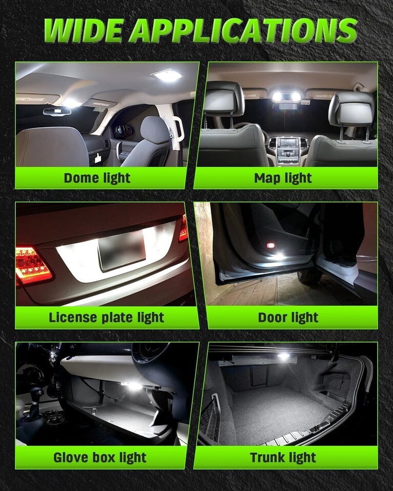 Wide Applications: Perfect for interior dome lights, map lights, glove box lights, door courtesy step lights, cargo lights, corner lights, trunk lights, vanity mirror light, and instrument lights.
