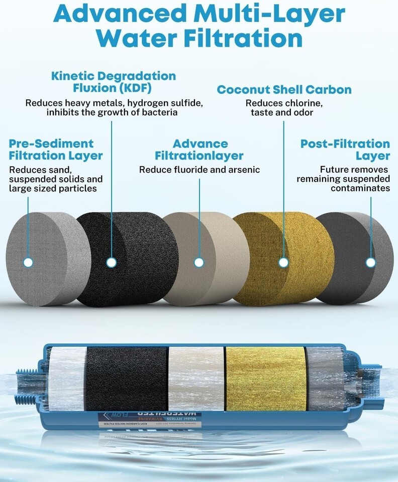 NSF and BPA FREE Certified: Enjoy peace of mind with advanced Granular Activated Carbon (GAC) and Kinetic Degradation Fluxion (KDF) technology, ensuring safe and efficient multi-stage filtration for your water.
