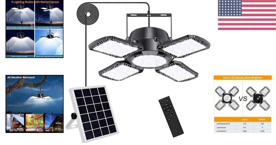 Elevate your outdoor and indoor lighting experience with our 176 LED Solar Powered Motion Sensor Light. The innovative 4-panel design offers unmatched brightness and versatility, ensuring you have light when and where you need it. With four adjustable lighting modes and the convenience of remote control operation, this light is perfect for any situation, whether it's illuminating your garden for an evening gathering or providing security for your shed.
