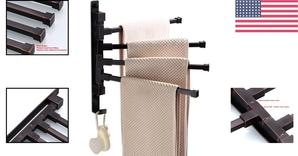 Space-Saving Design: This innovative swivel towel rack features four arms that provide ample space for hanging and organizing bath towels, face towels, and clothing in compact areas.