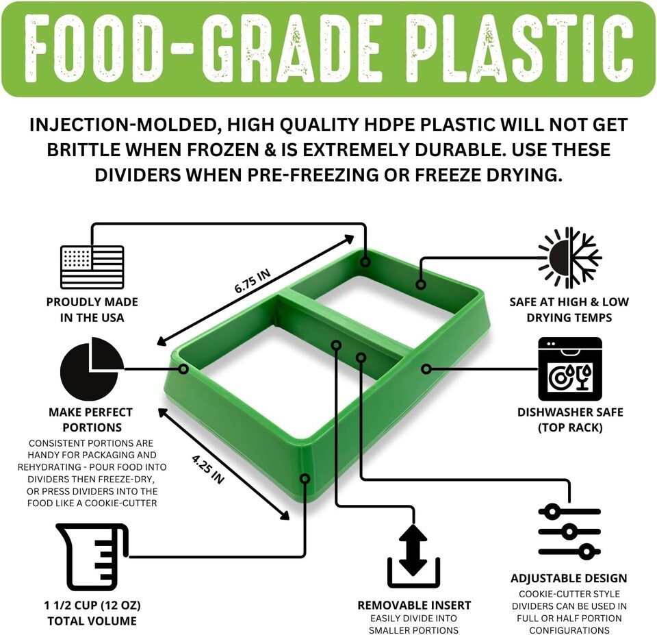 Say goodbye to the hassle of portioning food while freeze drying. Our Dish Washer Safe Green Tray Dividers are the perfect companion for thick liquids like salsa, chili, smoothies, yogurt, and more. They streamline your portioning process, allowing for efficient meal planning and maximizing your storage space. Crafted from food-safe, BPA-free plastic, you can trust that your safety is our priority.