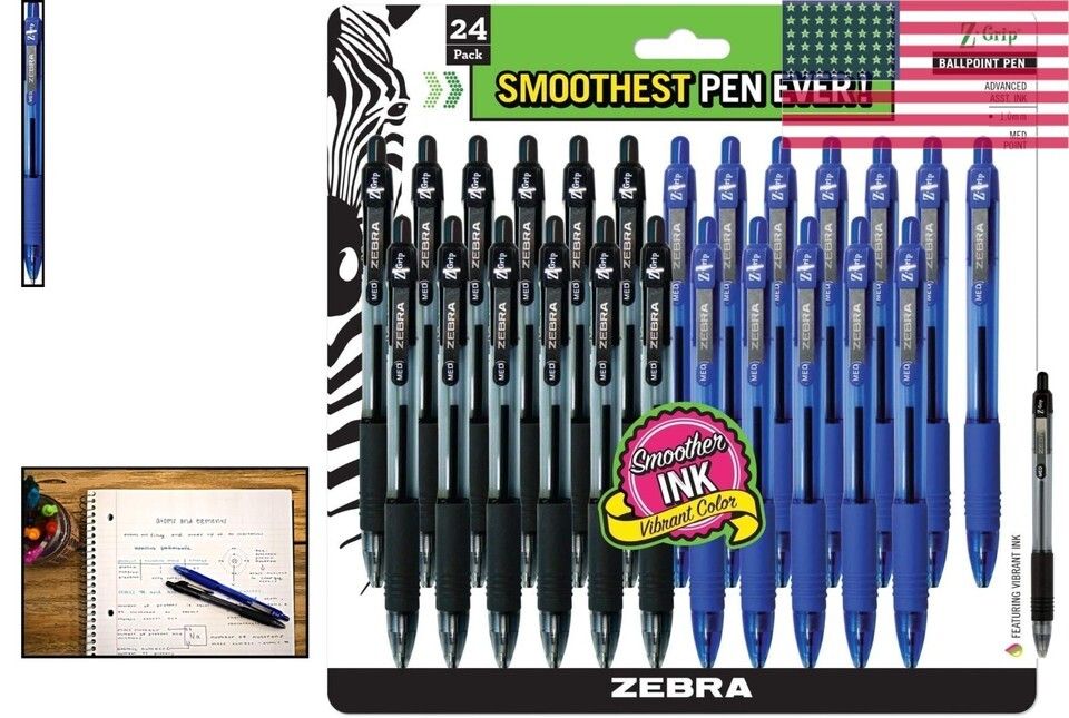 24-Piece Pack of Zebra Z-Grip 1.0mm Black Blue Ballpoint Pens - Smooth Ink
