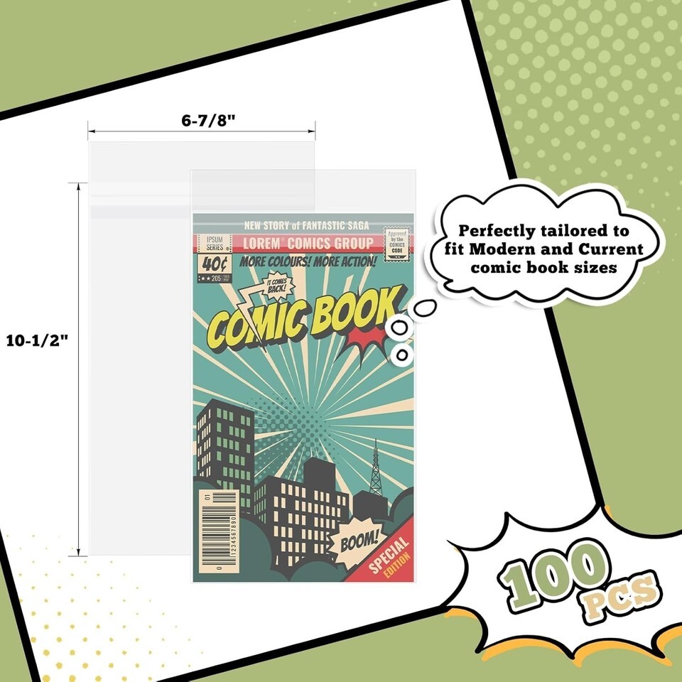 Acid-Free Crystal Clear Comic Bags 100 Pcs, 6 7/8 x 10 1/2 for Modern Comics