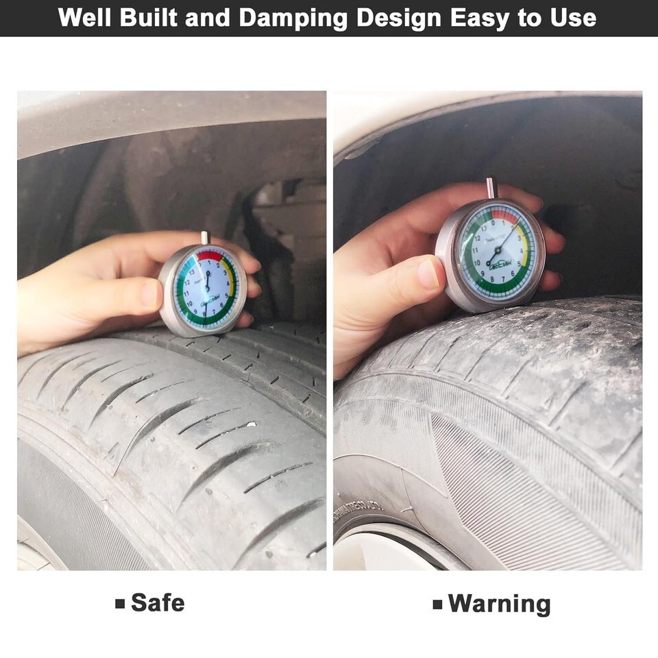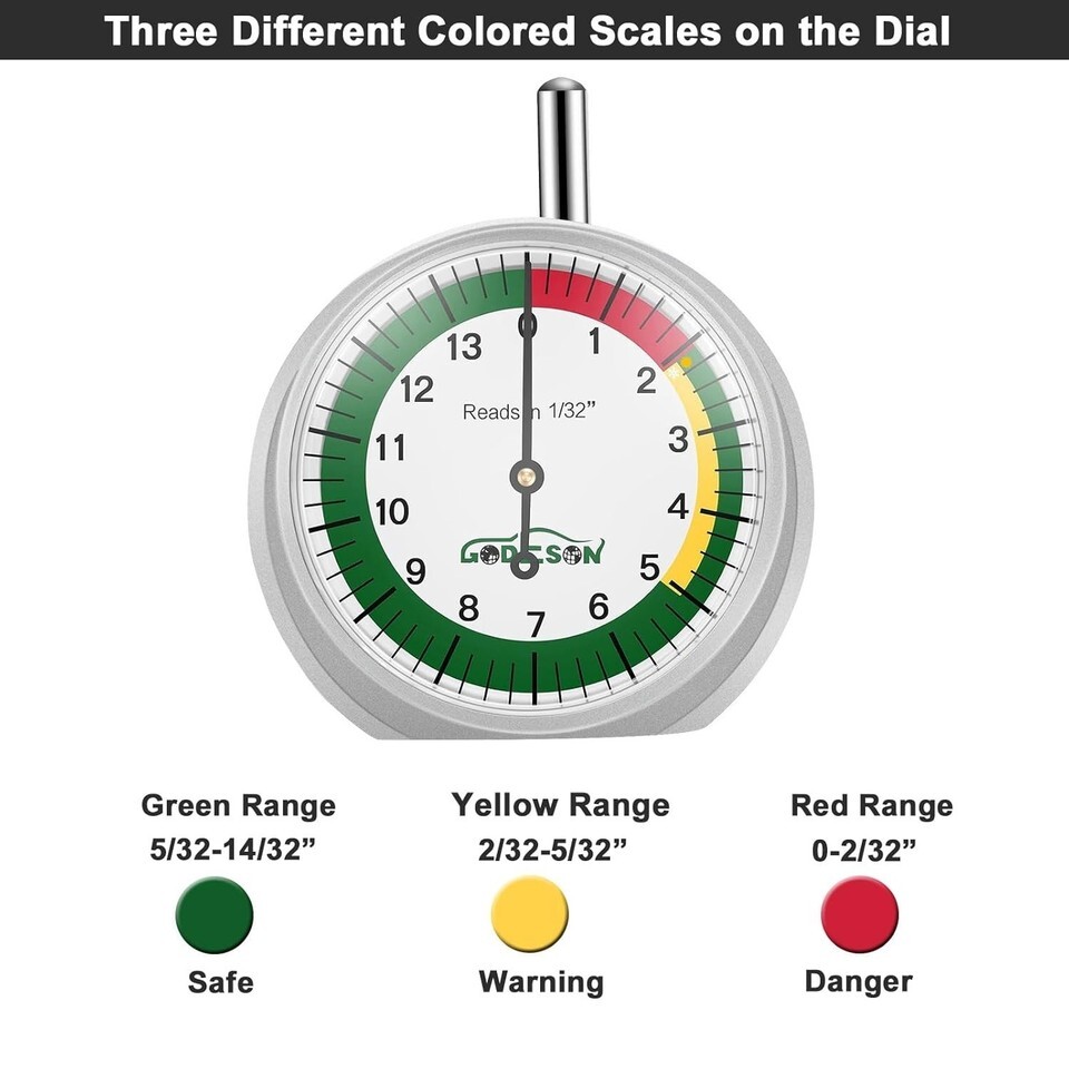 Easy to Read: The color-coded dial represents different tread depth ranges ? safe range (green), showing wear (yellow), or needs replacement (red) ? allowing for quick and effortless readings without confusion.