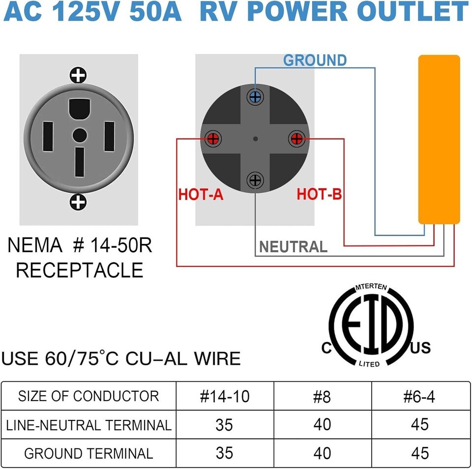 ETL Listed: Secure 50A RV receptacle, NEMA 14-50R outlet rated at 125V with a robust type 3R enclosure for rain protection, compatible with standard 50A NEMA 14-50P RV cords.