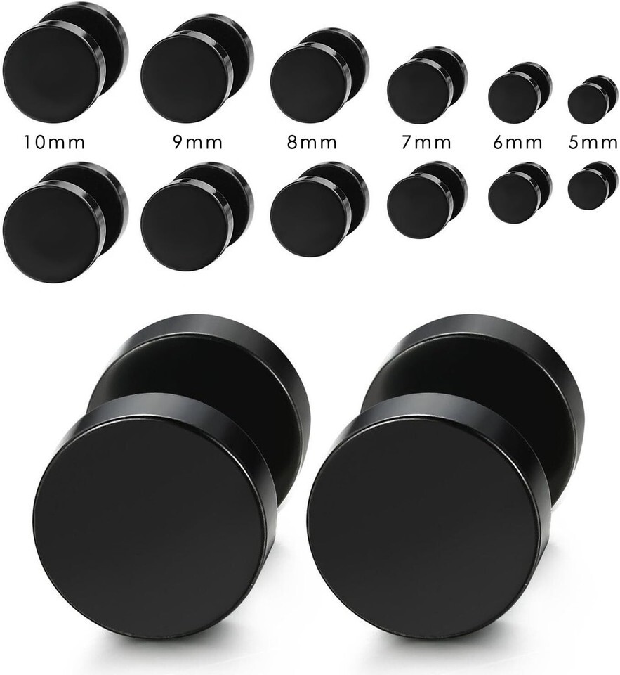6 Pairs Black Stainless Steel Stud Earrings for Men & Women - 5mm-10mm Sizes