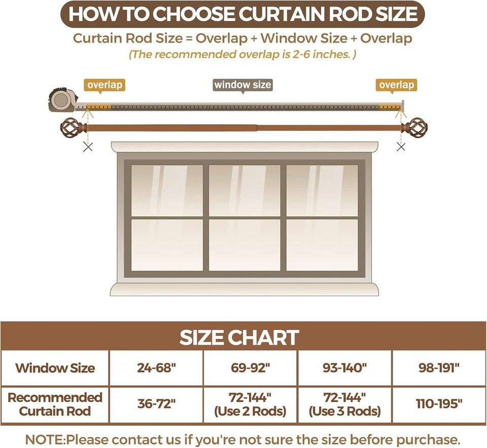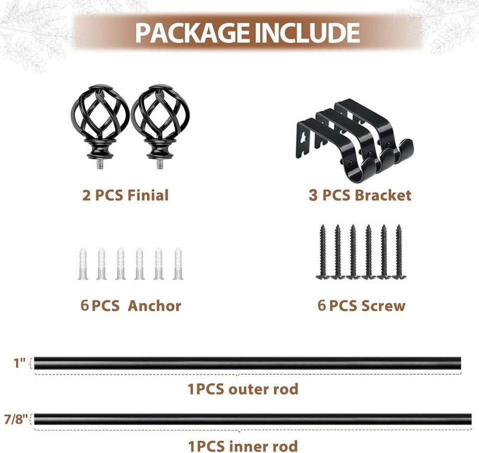 Items Included: Curtain Rod,1x 1" outer rod,1x 7/8" inner rod,2x finials,3x brackets,6x screws set