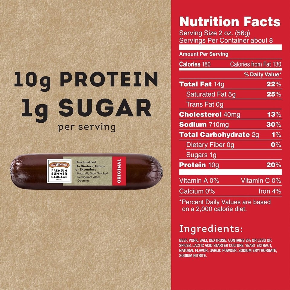 16 oz of gluten-free, high-protein summer sausage, ideal for snacking or as part of a meal.