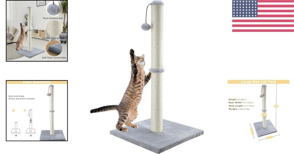 34-Inch Tall Cat Scratching Post - Natural Sisal & Playful Ball for Indoor Cats