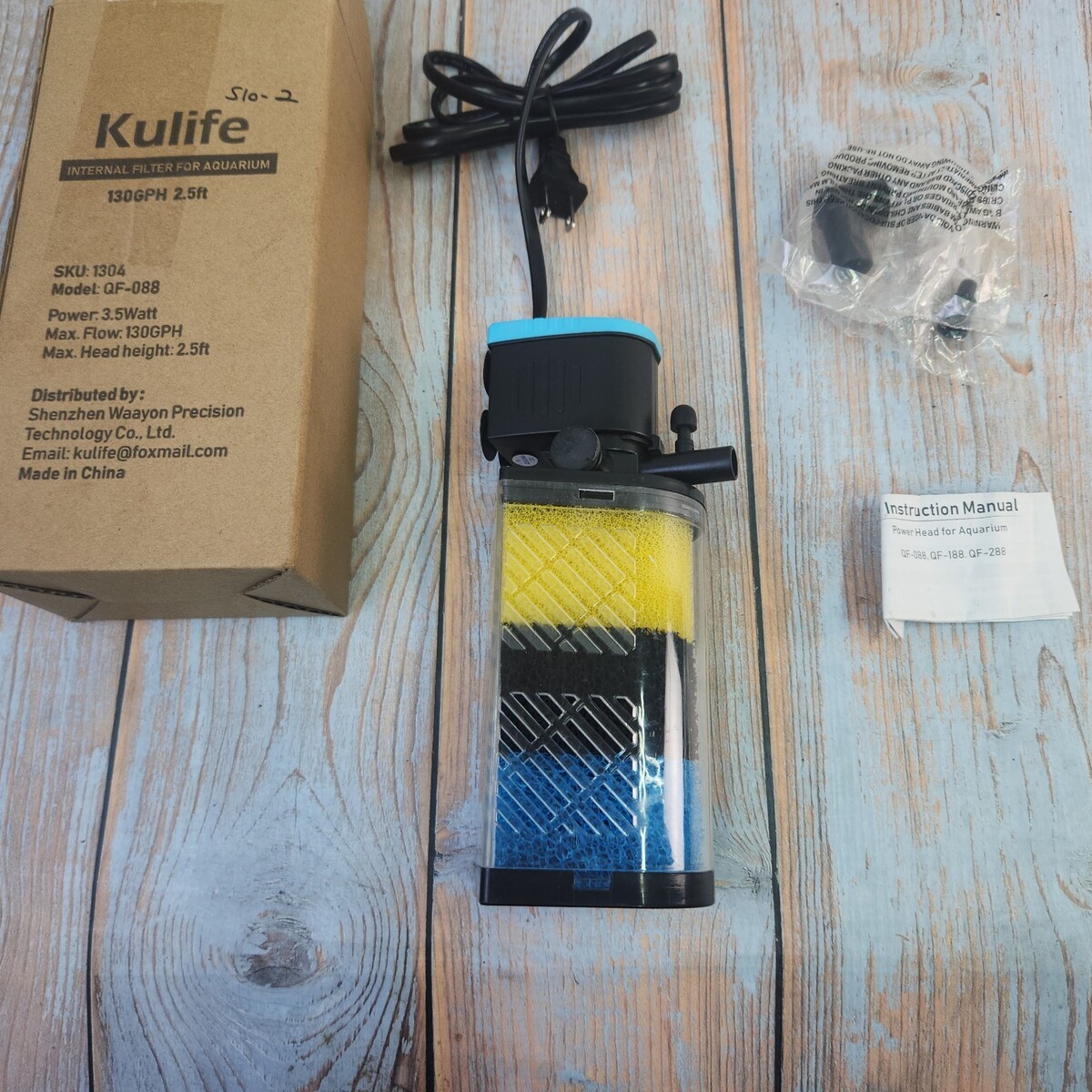 Exact item is shown. New open box with original packaging in fair condition. Max. Flow 130GPH (500L/H), Max lift 2ft (0.6m), Power 3.5W. 3 stage sponge filtration. Set weight 1.2 lbs. Made in China. No returns if installed or modified. This item is new with opened or damaged packaging. It may or may not be a customer return. It has been inspected and passed quality control to insure the condition described and contents are accurate. It may show minor wear from handling. Please review actual photos as stock photos are not the actual item, our photos are. You will ONLY receive exactly what is shown in photos, regardless of what might have originally been included. Please review our business policies in our store for information regarding returns, shipping and warranties.