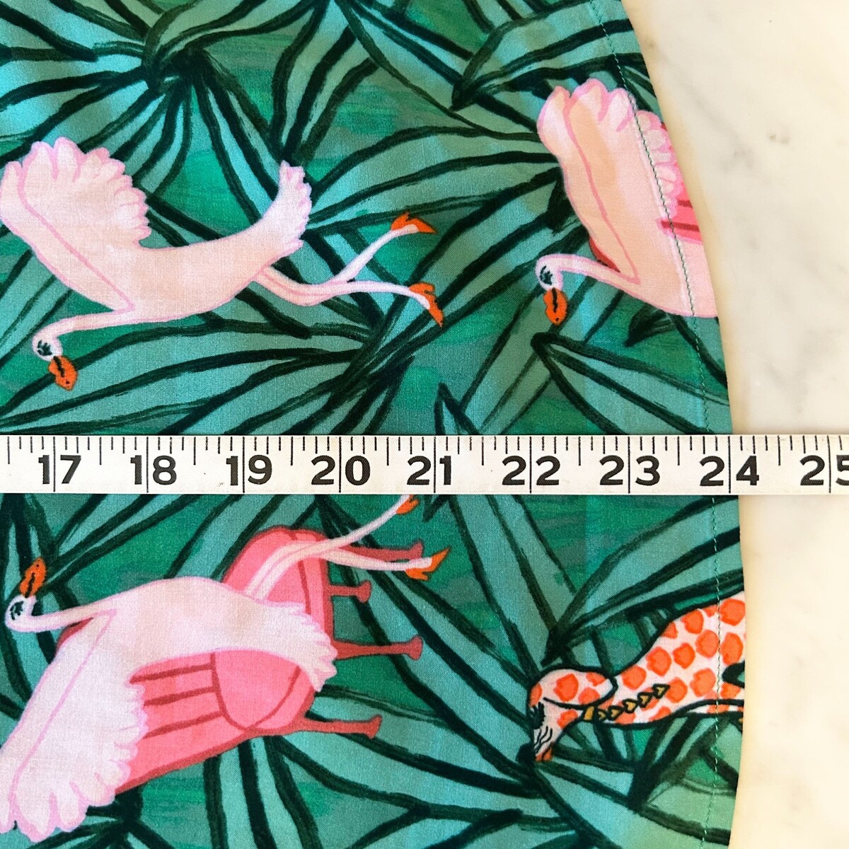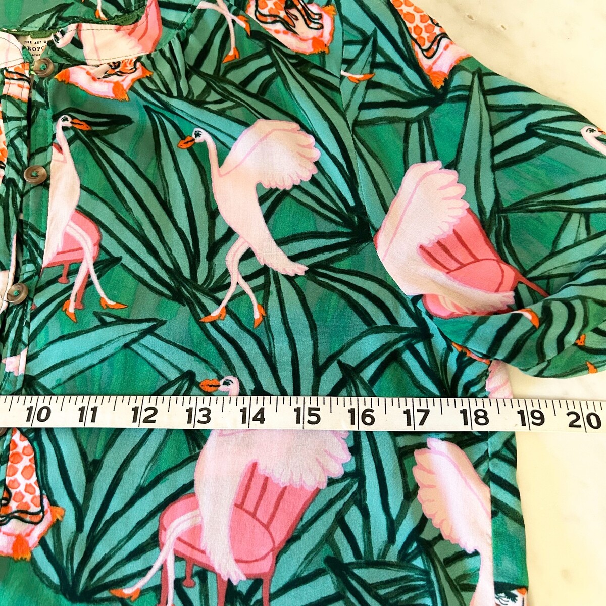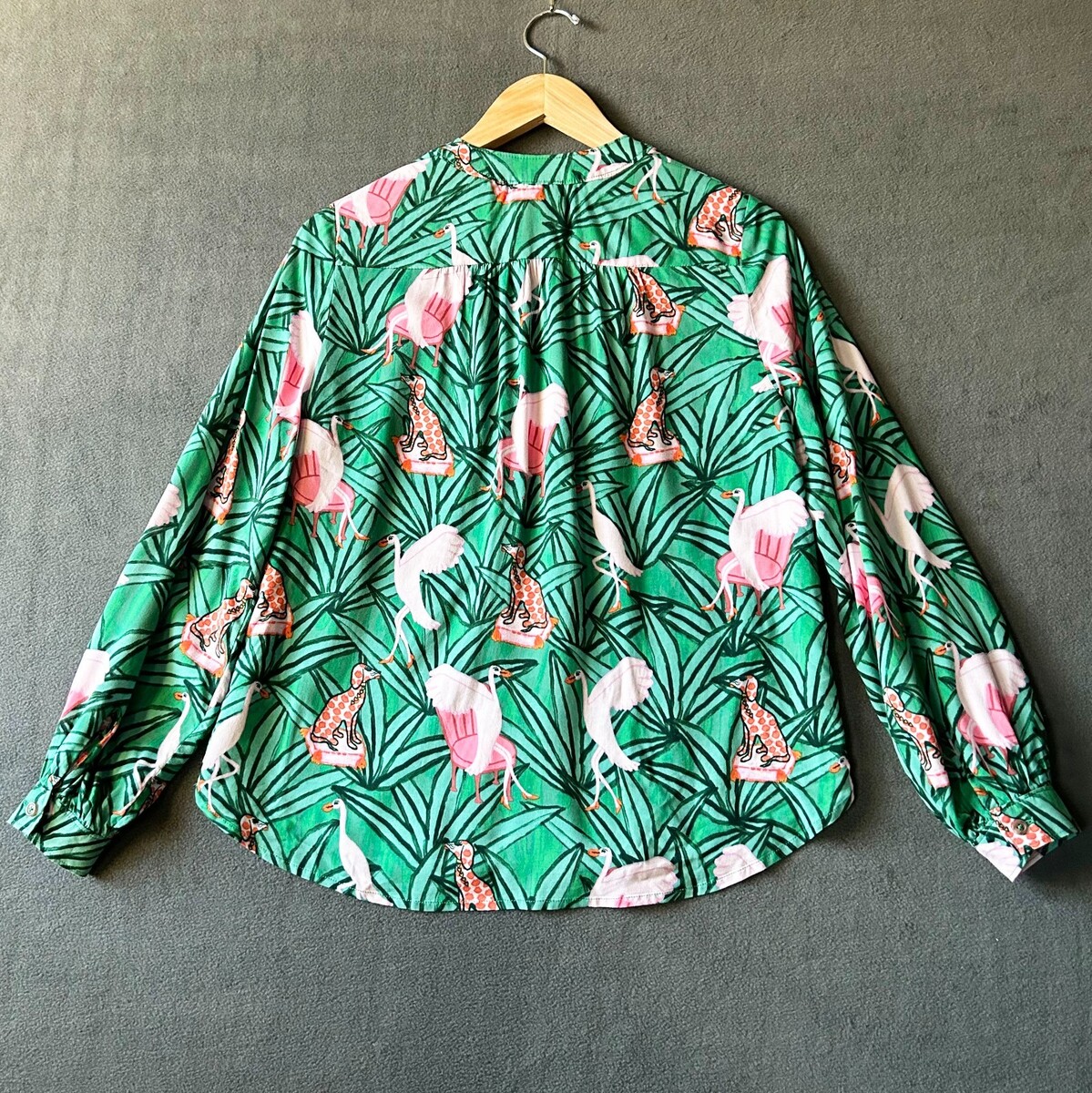 Vibrant and playful Kendra Dandy button-down blouse featuring a bold tropical jungle print with pink and white birds and orange dogs among lush green palm leaves. Lightweight, artistic, and perfect for adding a pop of color and creativity to your wardrobe.