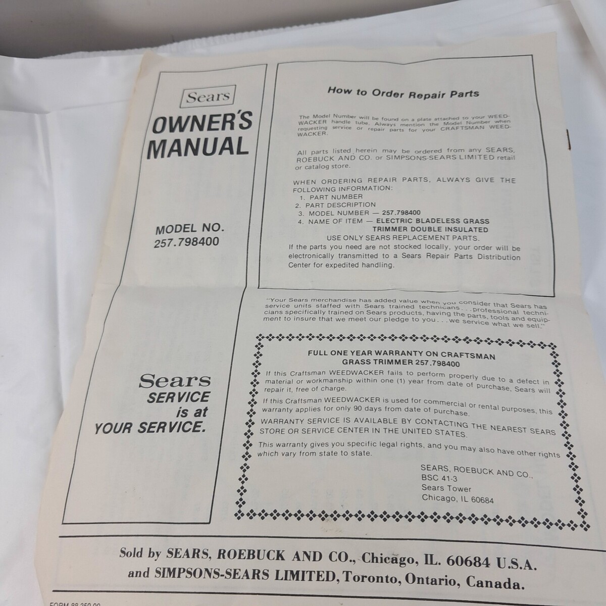 Sears Craftsman Electric Weedwacker 257.798400 Owner's Manual Bladeless Trimmer(wear/marks as shown)