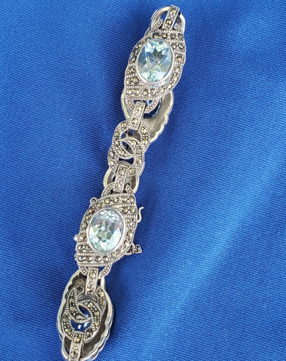 Designer 925 sterling blue topaz and marcasite filigree chain link bracelet.