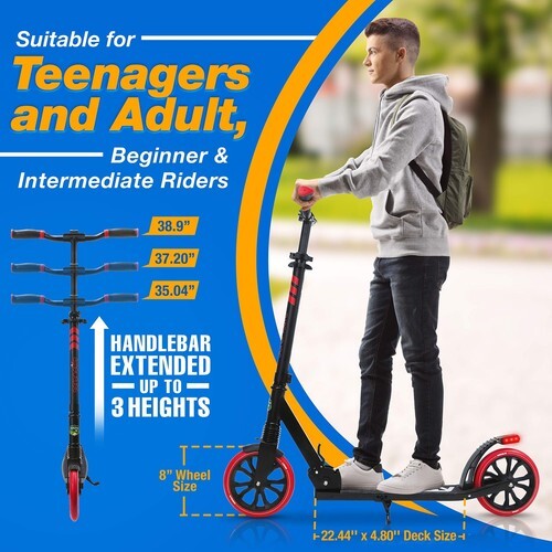 Compact Kick Scooter Lightweight Alloy Deck Smooth Riding Wheels Comfortable T-Bar Handlebar Durable ABEC-7 Bearings T-bar Anodized Clamp Collar Includes Extended Standing Area for Pro-style Scooter Performance Stand Kick Scooter Design with Rubber Grip at Tip Adjustable T-Bar Handlebar Height Long-Lasting, Super Smooth Gliding Wheels Easy Maneuvering Lab Tested Safety Certified Indoor/Outdoor Use Suitable for Teenagers and Adult, Beginner and Intermediate Riders Long Guard Rail to Stop Easily Mud Guard Front Wheel Extended up to 3 Heights Easy Folding Technology Foldable Handles Non-Slip Rubber Deck + Foot Stand Front Suspension Easy Open and Close Red Flashing Light What's in the Box: (1) Teens Scooter (1) Simple Tools for Assembly (1) Carry Strap (1) PE Warning Bag (1) LED Back Light Technical Specs: Construction Material: 20% Steel + 80% Alloy Wheel Type / Wheel Material: PU Wheel Recommended Age: 8+ Weight Capacity: Up to 220 lbs. Handlebar Height Setting: 35.04?? x 37.20?? x 38.9?? -inches Wheel Size: 8?? -inches Deck Size: 22.44'' x 4.80'' -inches Folding Size: 31.89? x 4.92? x 12.72?-inches Unfolding Size: 36.02? x 18.5? x 38.9? -inches Total Scooter Size (L x W x H): 36.6?? x 18.9?? x 38.8'' -inches Sold as: 1 Weight: 13.84 lbs.