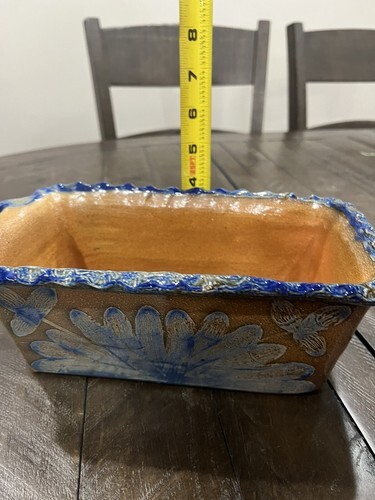 This beautiful stoneware pottery bread pam is a must-have for any kitchen. Handcrafted by Salt of the Earth, it features a stunning blue floral design on its clay material. The piece is signed by the artist and is part of the Earth product line.