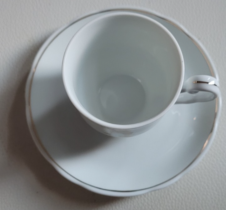 This set is in good used condition. There are no chips or cracks that I found. There is a mark on the bottom of the saucer, as seen in the photos.