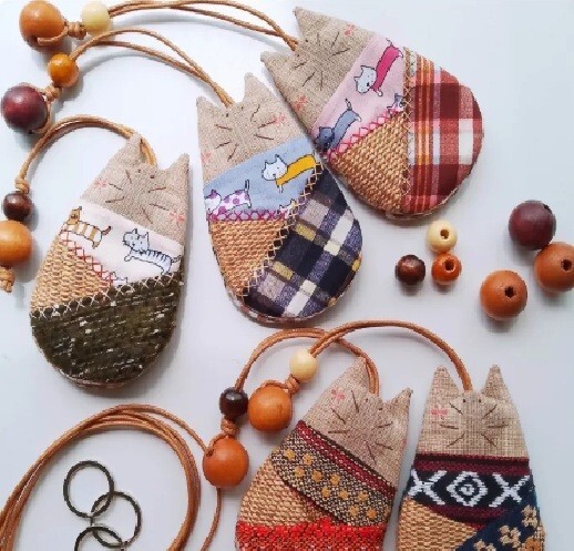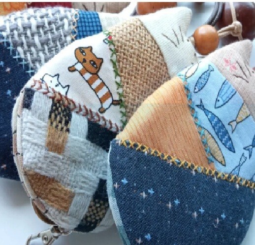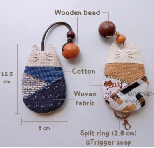 This cute hand-stitched cat key cover is handmade from a mix of premium Japanese cotton + woven fabric, decorated with a wooden bead. Each piece has its own unique pattern ? no two are exactly the same.