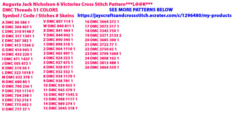 Augusta Jack Nicholson 6 Victories Cross Stitch Pattern***L@@K***