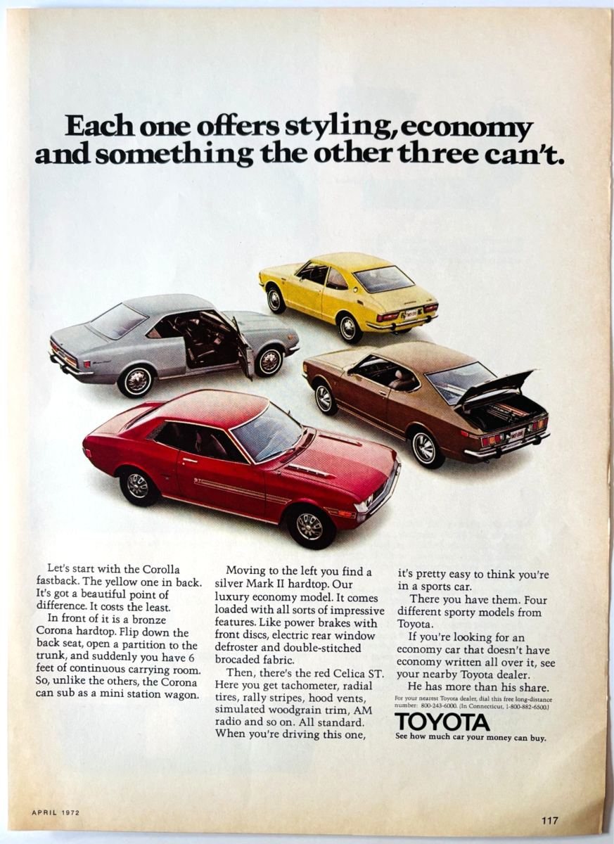 1972 Toyota Corolla Corona Celica ST Advertisement Vintage Automobile DWW10E