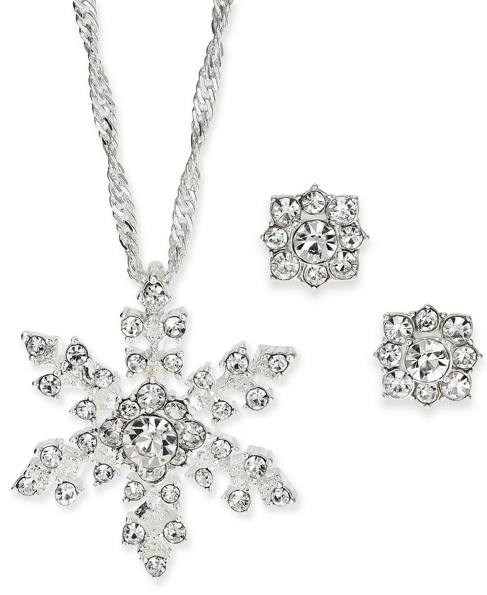 This is for a brand new in gift box Charter Club Women's Two Piece Crystal Snowflake Necklace Earring Gift Set An icy gift set sparkling with crystals that includes a chic pendant necklace and pair of stud earrings. From Charter Club. Set in silver-tone mixed metal Necklace approx. length: 17" + 2" extender; approx. drop: 1-1/5" Earrings approx. diameter: 1/4" Lobster clasp closure (necklace); Post back closure (earrings) Item comes packaged in a gift box