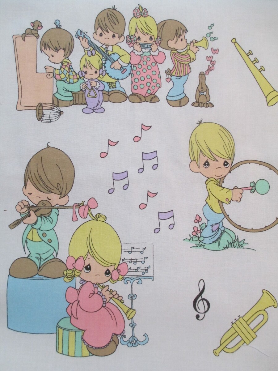 This listing is for Spectrix fabric featuring Precious Moments characters that I would consider vintage, dated 1993. There are 4 different designs the listing is for one of each. When I found it, I pondered what it could have been intended for as it is not a quilt panel nor fabric by the yard but merely a square (14" x 18") with Precious Moments characters centered around a common theme. Judging from the size of it, it could have been meant to be framed and hung in a baby nursery although there are other possibilities such as a small tote bag or pillow. Putting several of each of these together would also make a nice child's blanket. The colors are all pretty pastels set on a white background, 100% cotton, with unfinished edges.