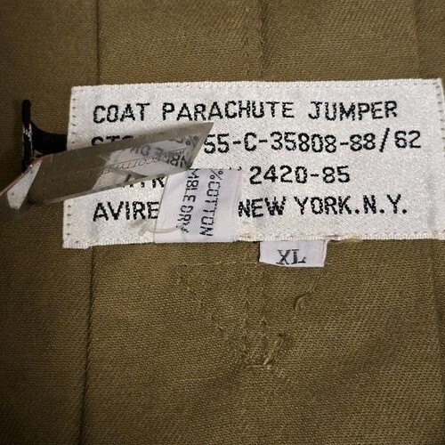 Excellent Condition Vintage Avirex M1942 Parachute Jump Coat WW2 Reproduction Men's Size XL. Actual measurements: 51" chest, 31.5" length, 19.5" across the shoulders, 20.5" underarm seam, 24" outerarm seam. Includes the belt. 100% cotton. Made in Korea.