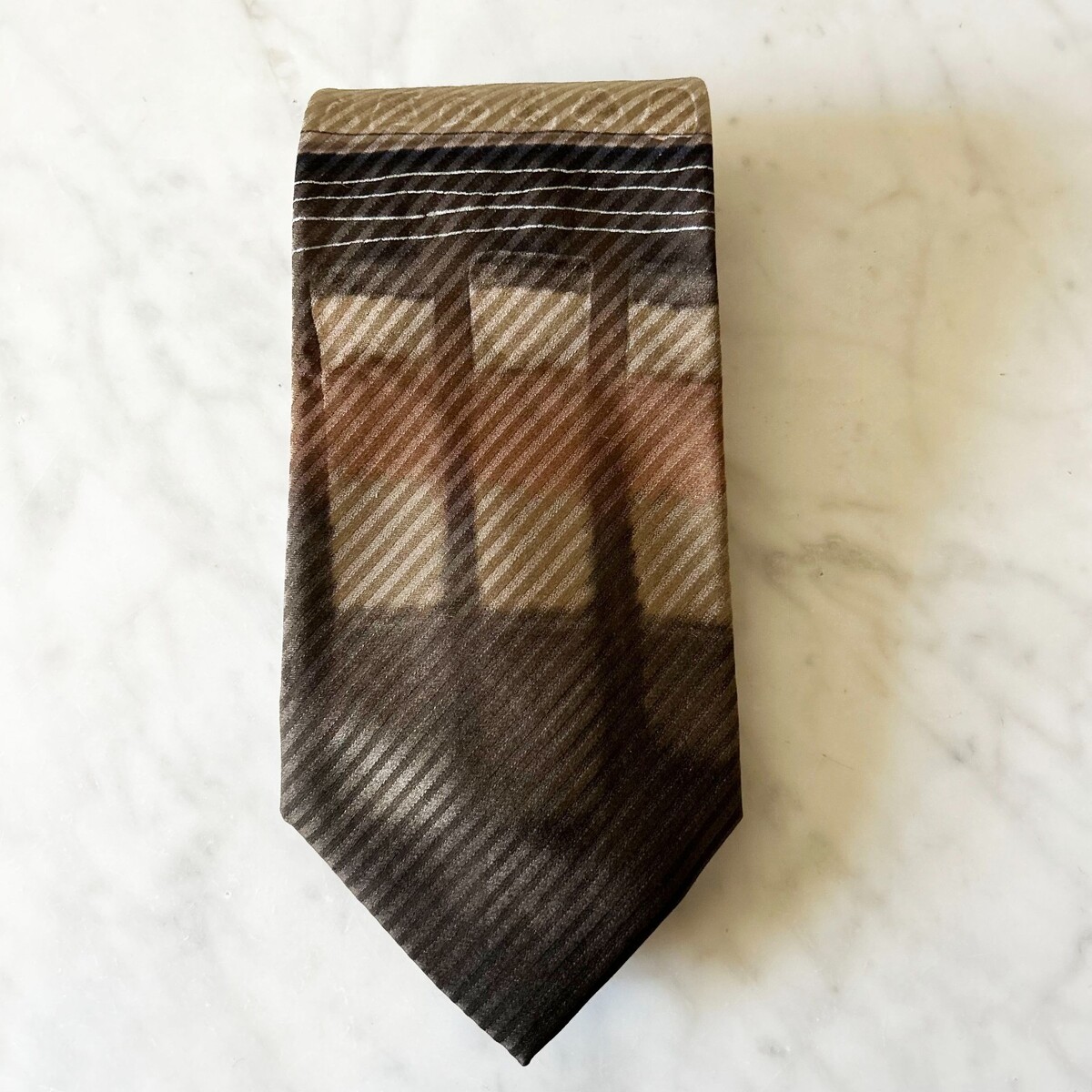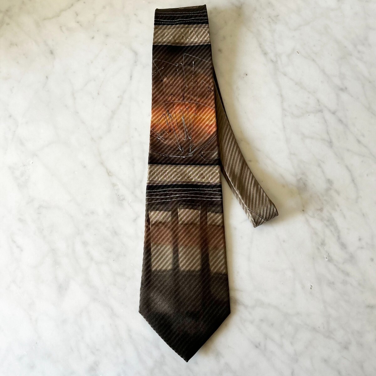 Robert Daskal handpainted men's silk neck tie. Abstract art design in brown, tan, orange and silver. 100% Silk. 57" long, 4" wide. Excellent condition.