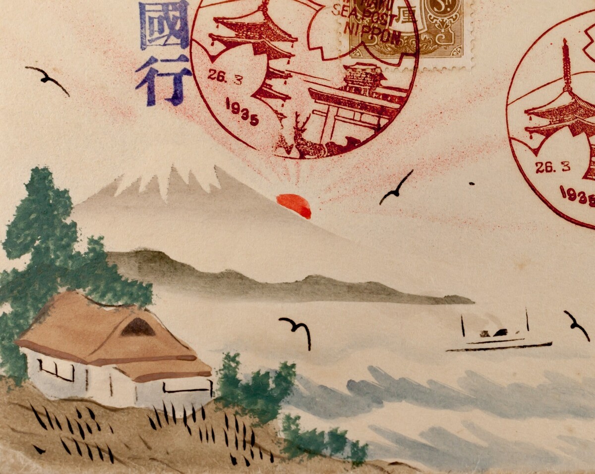 Karl Lewis 1935 handbemalte Aquarellbedeckung Japan an IL, USA Hikawa Maru C-6