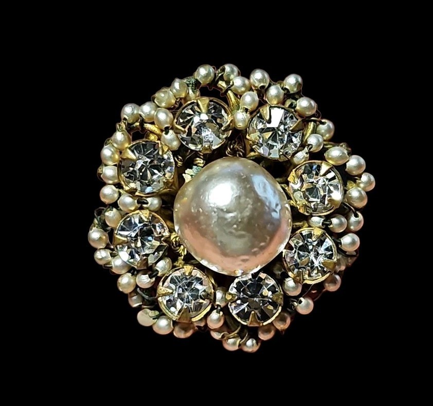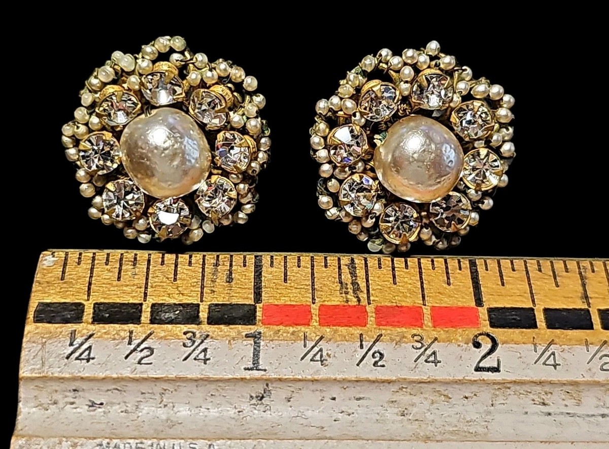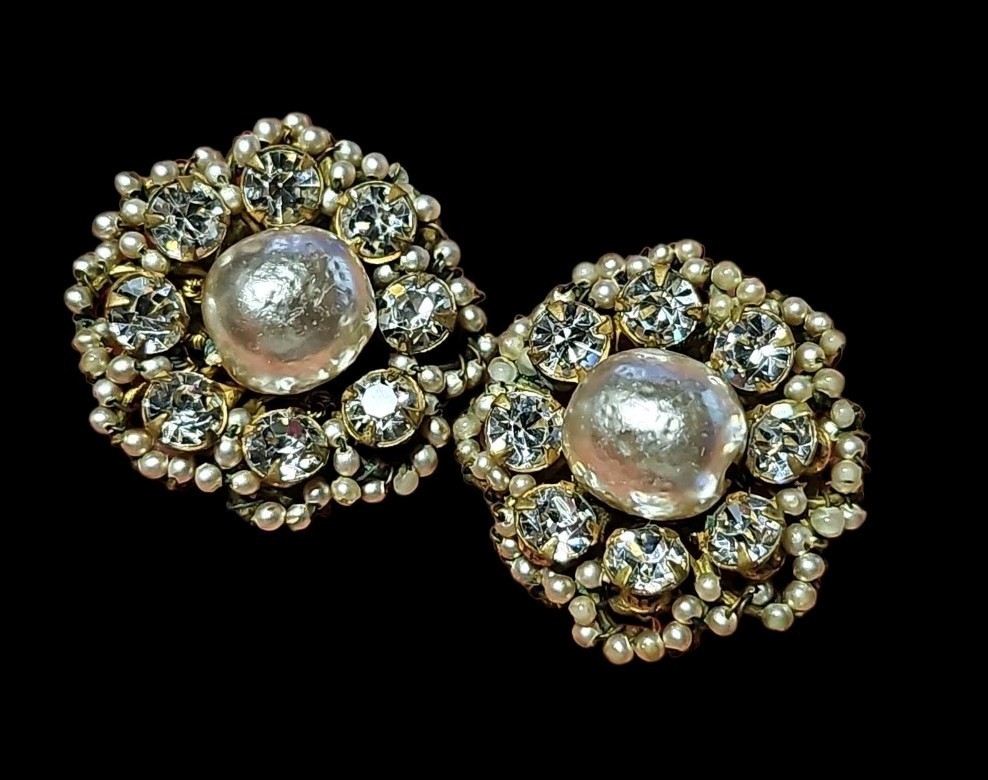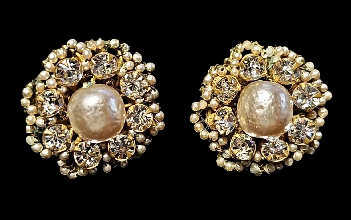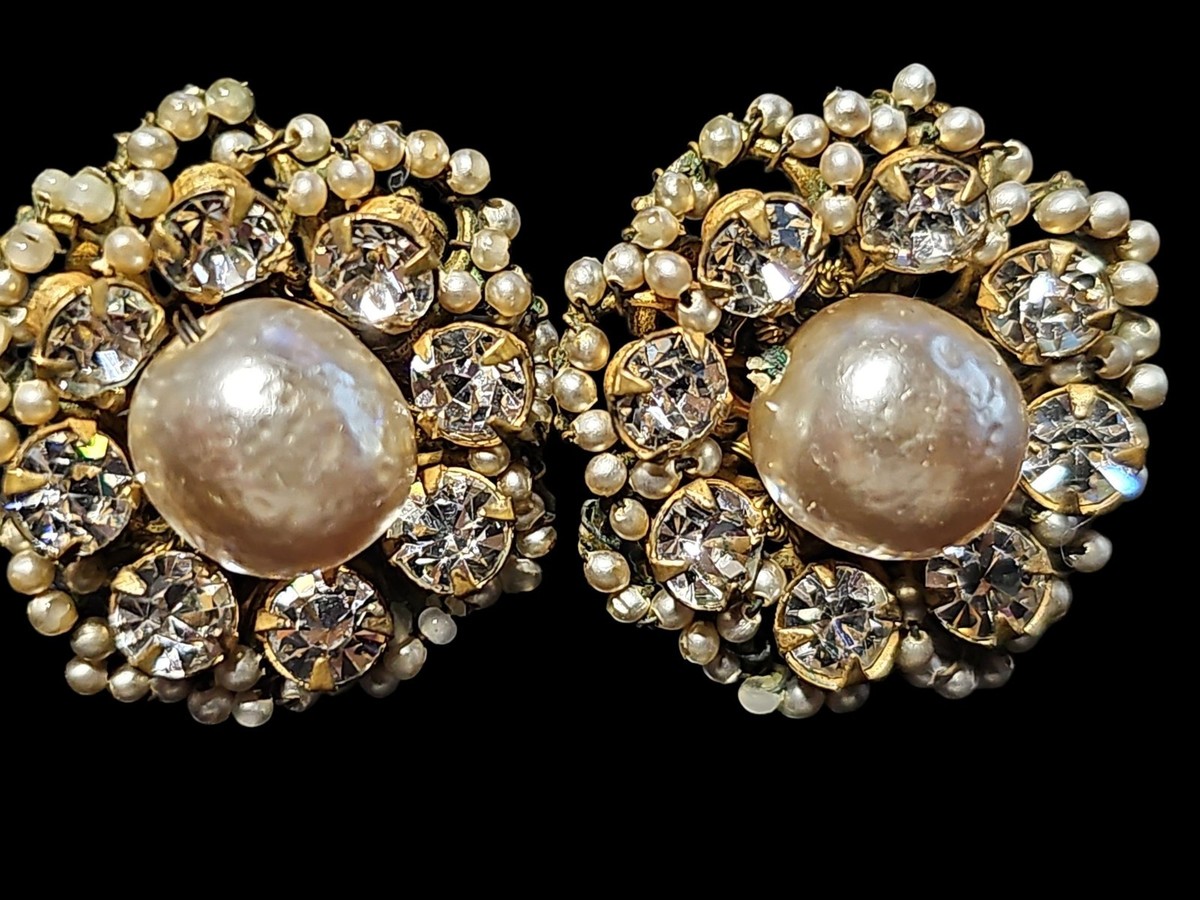 UP FOR SALE: Beautiful vintage signed Miriam Haskell clip earrings featuring mabe pearl centers surrounded by sparkling rhinestones and classic Haskell wired construction. Elegant dimensional cluster design. Signed on back. Clips function properly.