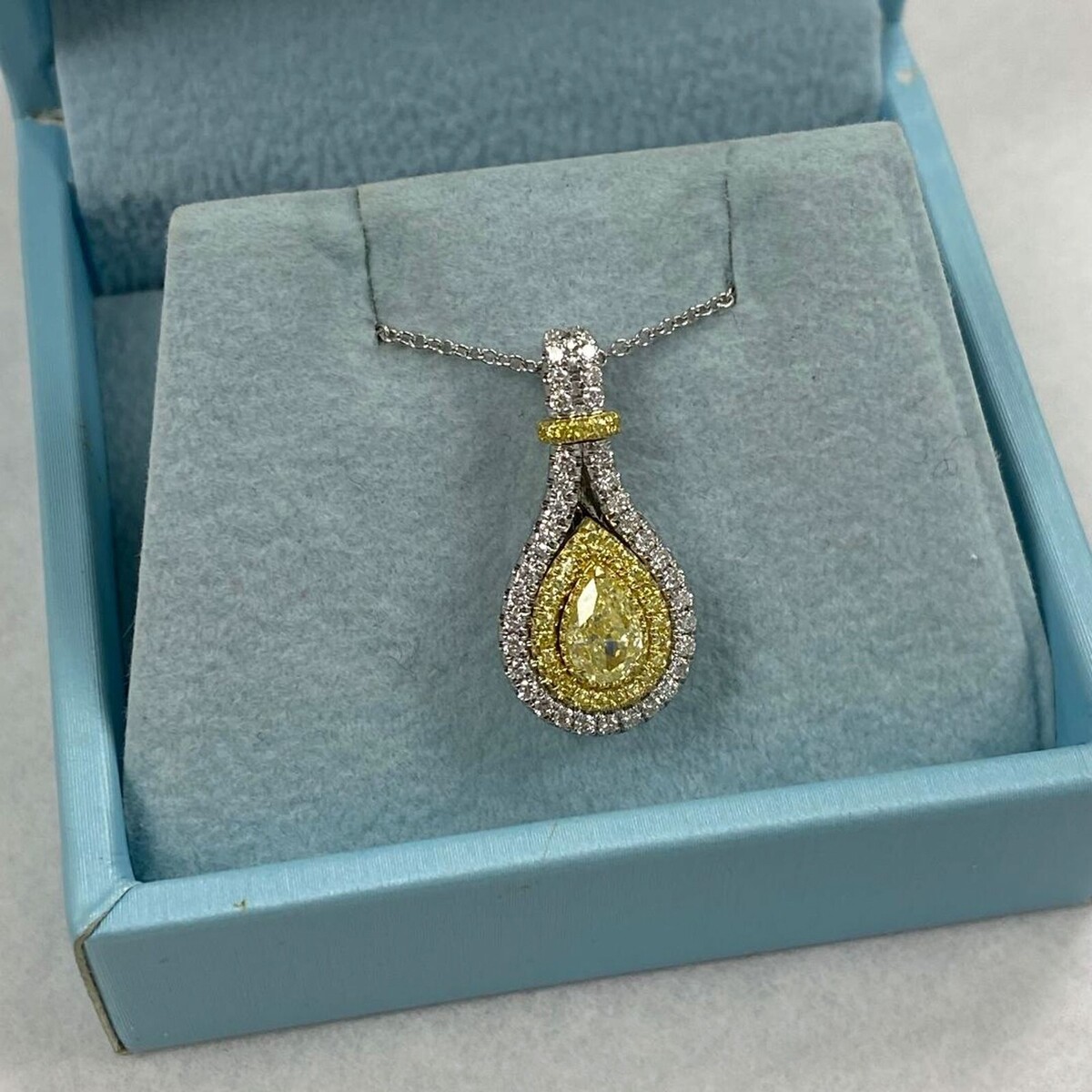 Ein schones Schmuckstück! Ein Anhanger mit einem brillant geschnittenen natürlichen, schicken gelben Diamant in 14 Karat Weißgold mit einer Tranenform und einem Art-Deco-Design. Umgeben von runden brillanten, geschnittenen doppelten Halogelb und farblosen Diamanten. Die 16-Zoll-Kette verleiht dem Gesamtdesign Eleganz. Diese Art von Schmuck hat oft einen auffalligen Kontrast zum gelben Diamanten gegen das Weißgold, wodurch eine faszinierende visuelle Anziehungskraft entsteht. Art -Deco -Designs sind bekannt für ihre geometrischen Muster und ihren mutigen, eleganten Stil, wodurch dieser Anhanger wahrscheinlich ein Statement -Stück ist.