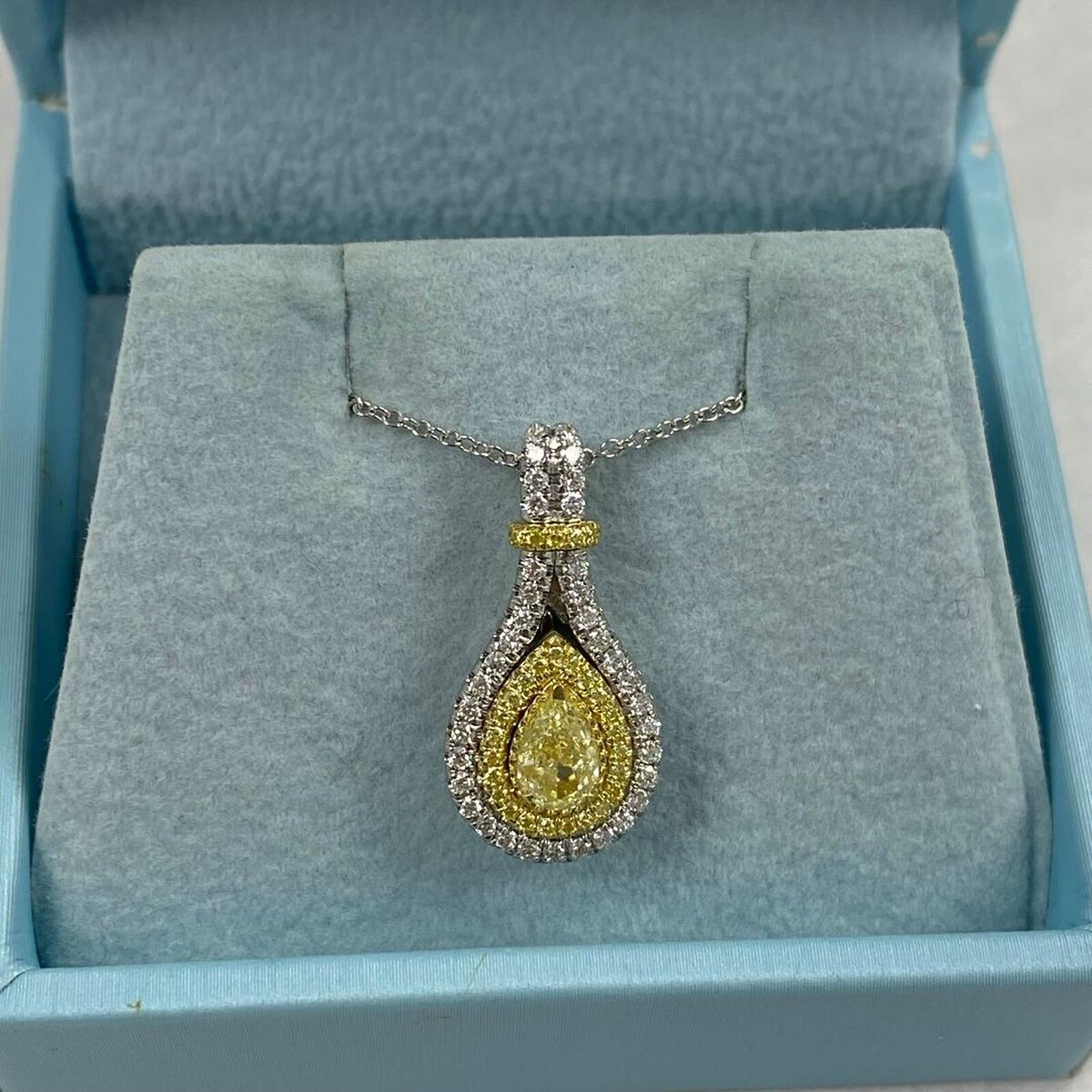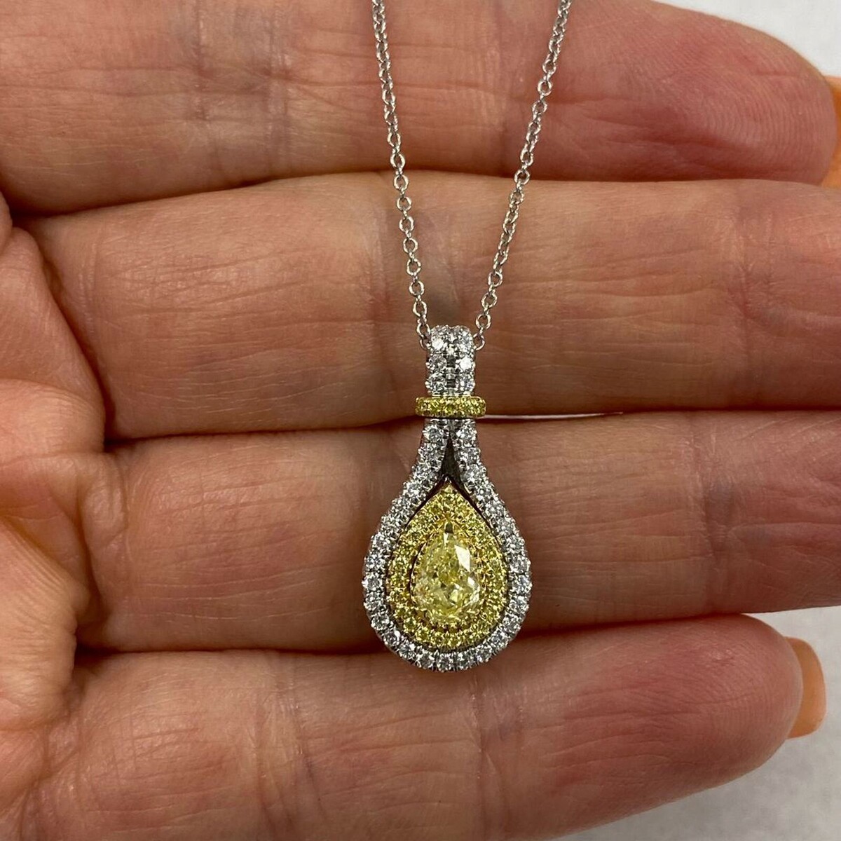 Ein schones Schmuckstück! Ein Anhanger mit einem brillant geschnittenen natürlichen, schicken gelben Diamant in 14 Karat Weißgold mit einer Tranenform und einem Art-Deco-Design. Umgeben von runden brillanten, geschnittenen doppelten Halogelb und farblosen Diamanten. Die 16-Zoll-Kette verleiht dem Gesamtdesign Eleganz. Diese Art von Schmuck hat oft einen auffalligen Kontrast zum gelben Diamanten gegen das Weißgold, wodurch eine faszinierende visuelle Anziehungskraft entsteht. Art -Deco -Designs sind bekannt für ihre geometrischen Muster und ihren mutigen, eleganten Stil, wodurch dieser Anhanger wahrscheinlich ein Statement -Stück ist. Unsere Produkte sind alle von Qualitat und Pflege im Herzen des Diamond District in der 47th Street in New York City hergestellt. Unser Engagement und unser E