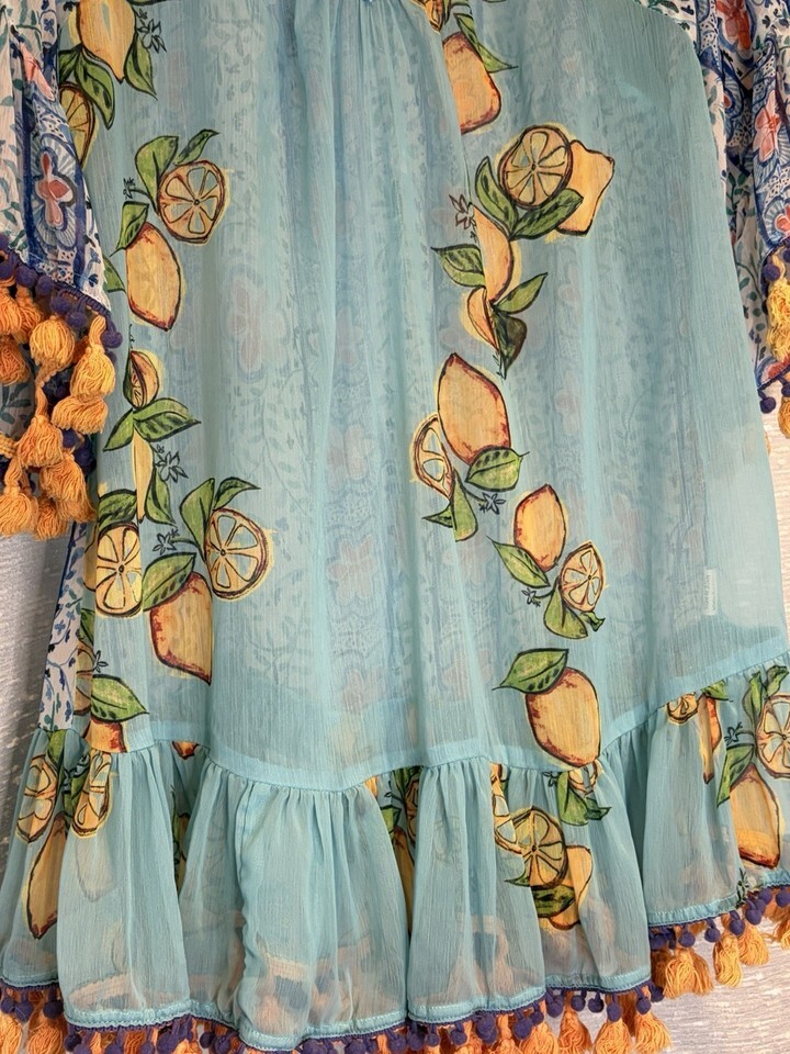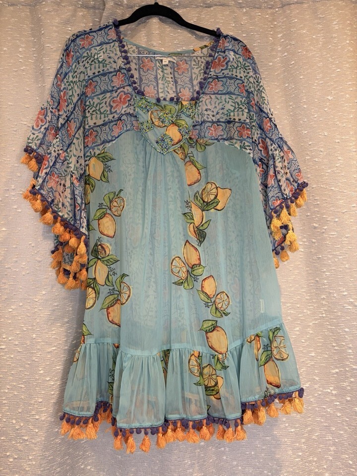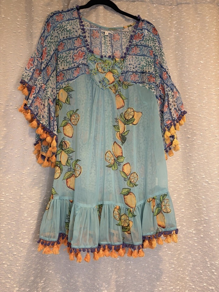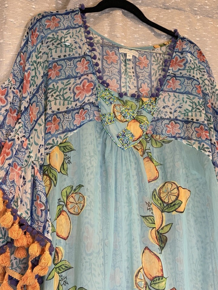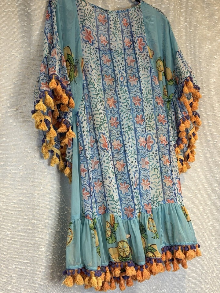 Modaposa Blouse / Cover Up Citrus Floral Tassels Peasant Boho Resort Size Med.