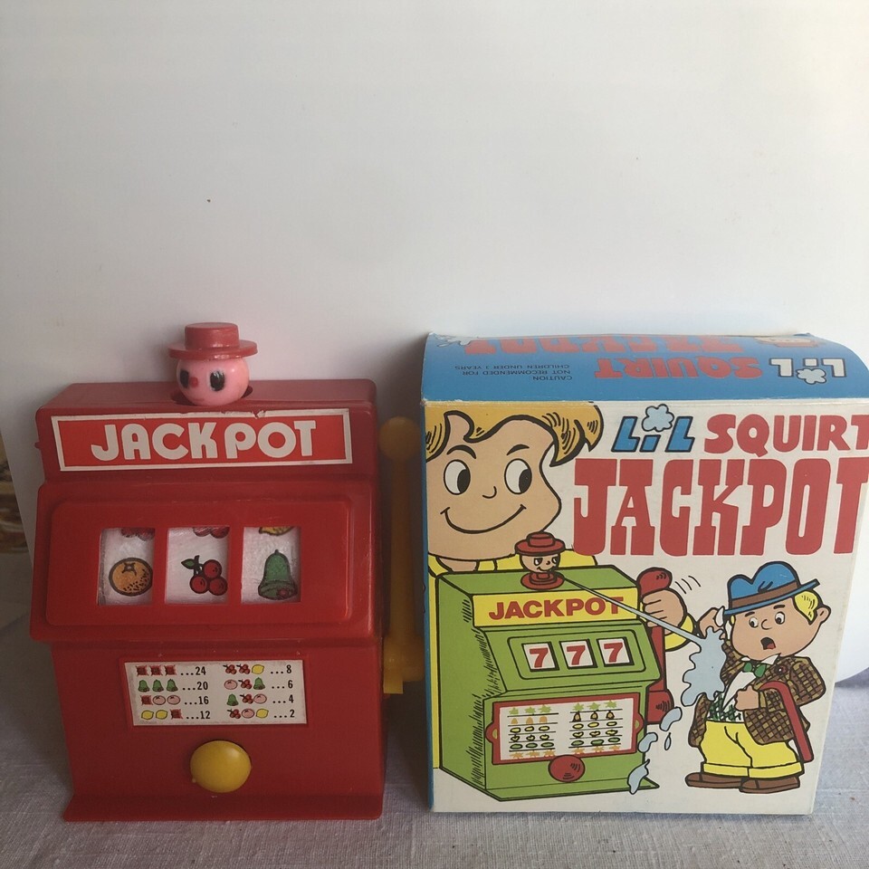 A vintage lil Squirt Jackpot Slot Machine gag novelty plastic toy. This toy is designed to resemble a miniature slot machine and is meant for amusement and entertainment purposes. It features a novelty aspect that involves squirting water, making it a fun and quirky addition to a vintage toy collection.