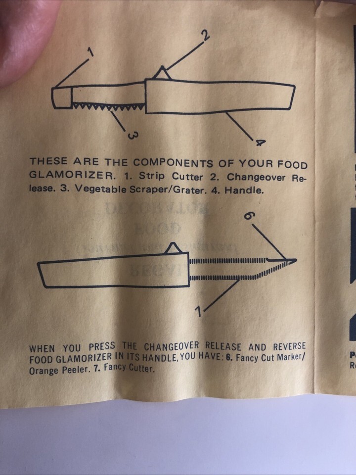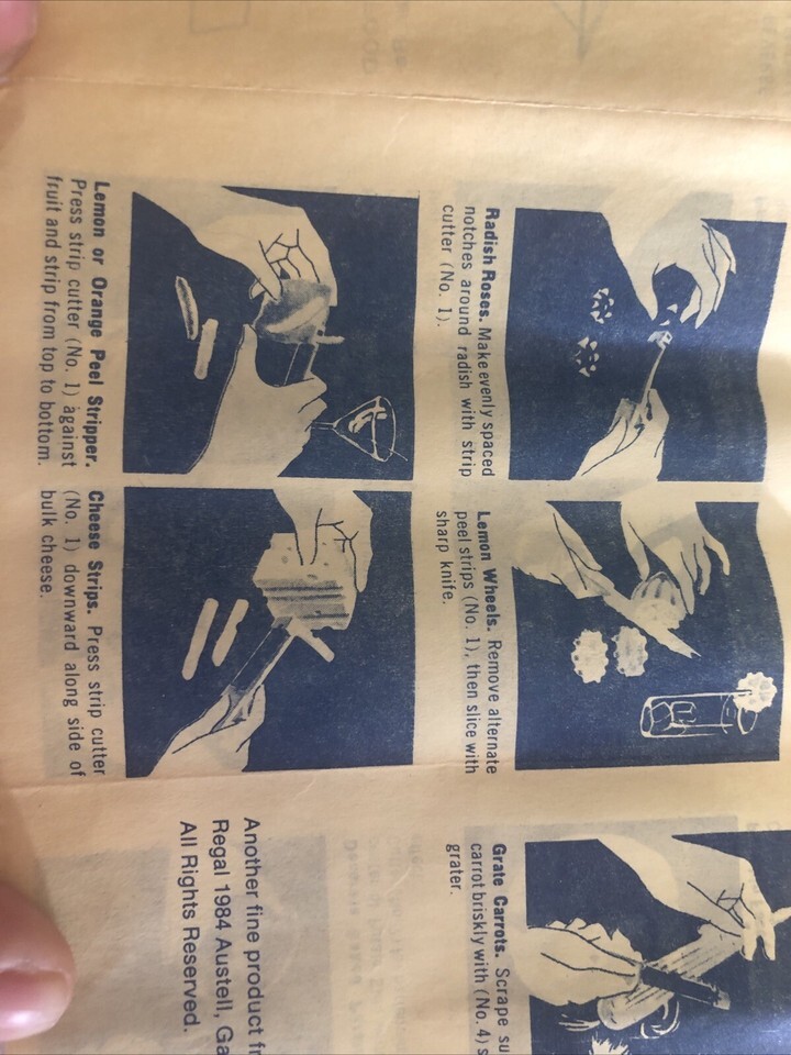 The "Regal Food Decorator" is a vintage kitchen tool from 1983/84 designed specifically for good decoration . It comes with instructions and is housed in its original open box. This food decorator allows users create decorative and shaped fruits veggies. The vintage design adds a nostalgic touch to any kitchen collection and is sure to bring back memories of baking from the 1980s.