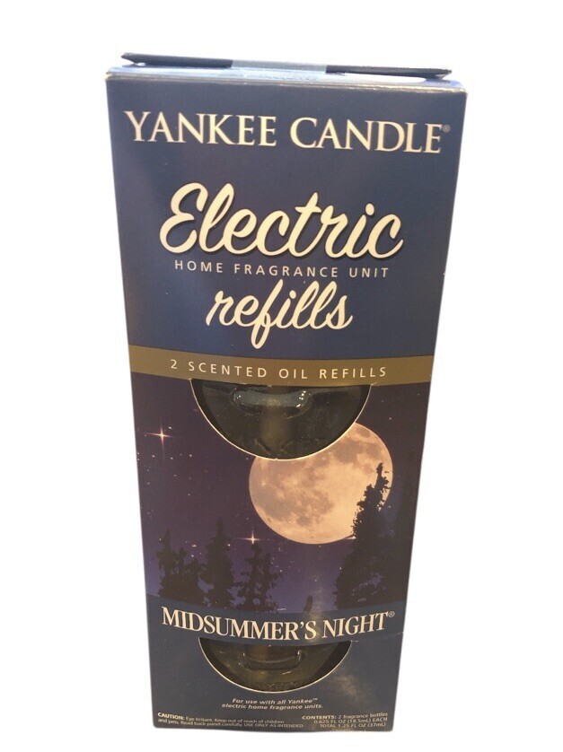 The Yankee Candle MIDSUMMER'S NIGHT Scented Oil Plug-In Refill set includes two sealed boxes of purple and blue scented oils. These electric oil refills are designed for adults and feature the Midsummer's Night scent by Yankee Candle. Perfect for use in any room of the home, these oils act as a deodorizer and odor eliminator, creating a pleasant and fresh atmosphere. Simply plug in the refill bottles to experience the calming and relaxing fragrance of Midsummer's Night.