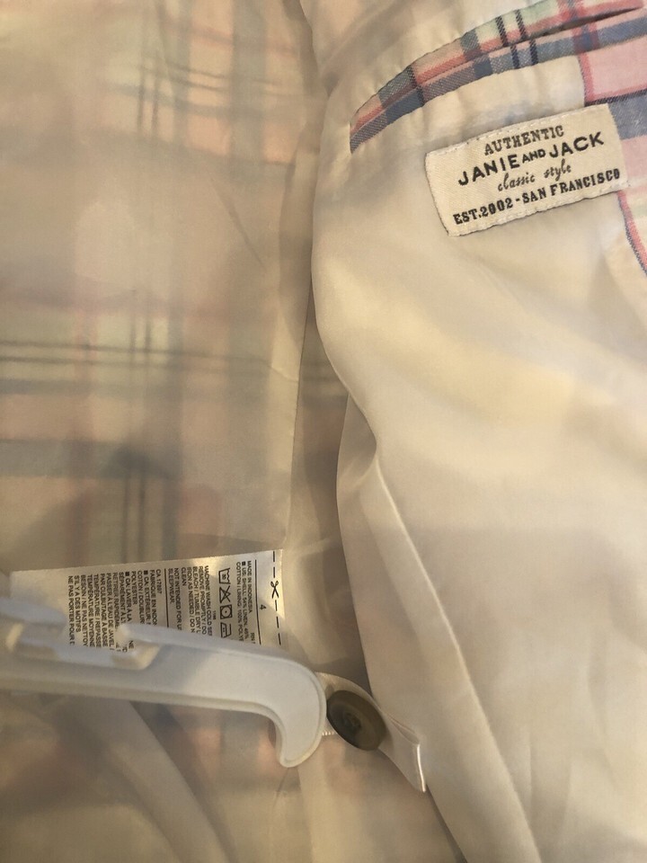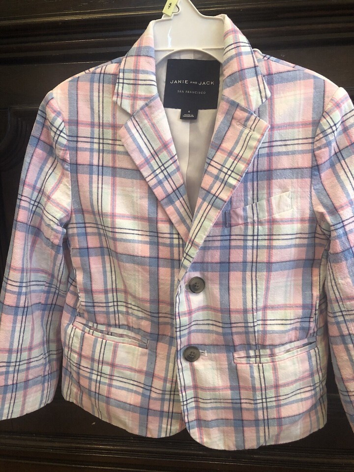 The Janie and Jack Madras Plaid Linen Blazer in size 4 is a stylish and preppy piece for young boys. This single-breasted blazer features a classic white plaid pattern, long sleeves, and is made from lightweight knit linen fabric. The blazer is designed in a one-piece style and is perfect for adding a touch of sophistication to any outfit. Lined for added comfort, this blazer from the reputable brand Janie and Jack is a versatile and on-trend wardrobe staple for boys who appreciate a preppy look.