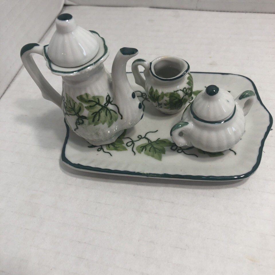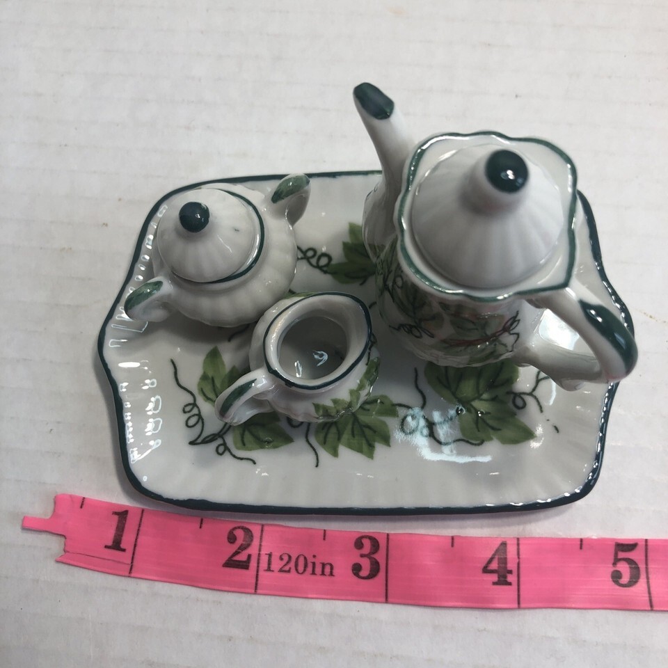 Miniature Porcelain Vintage Tea Set Tray Tea Kettle Sugar and Creamer Bowl