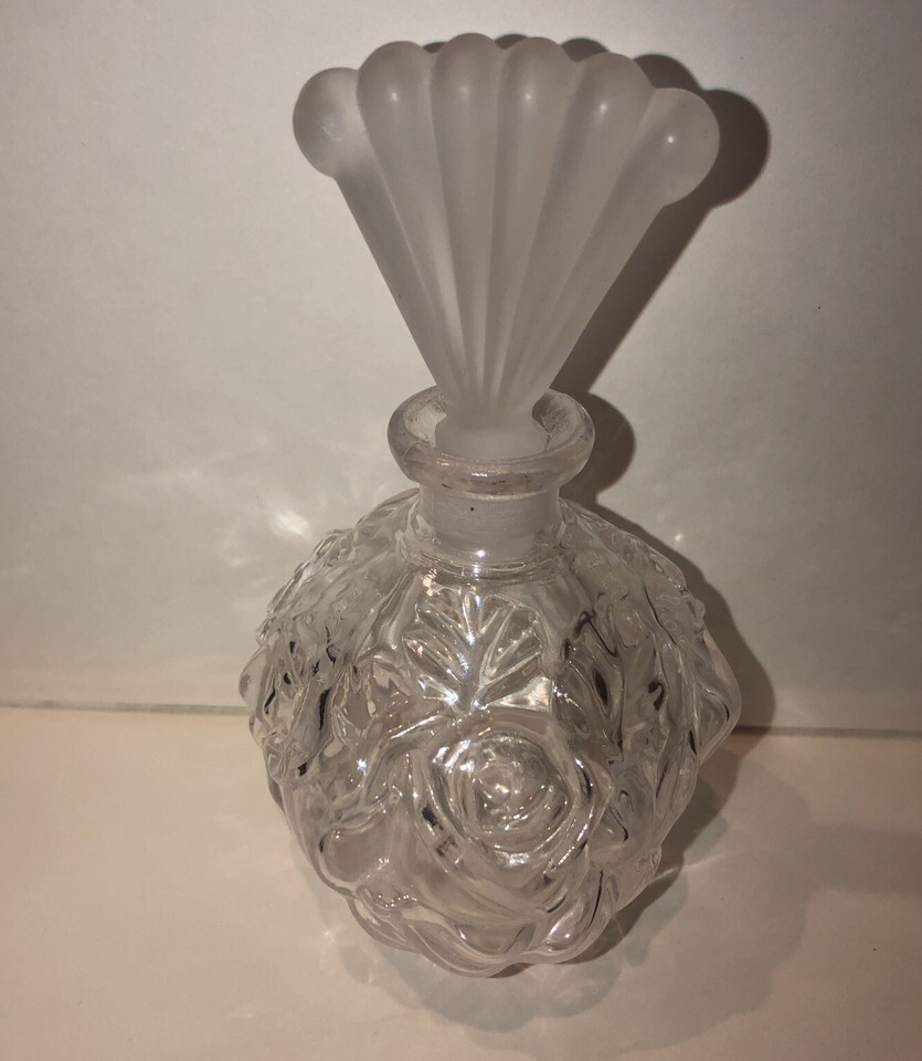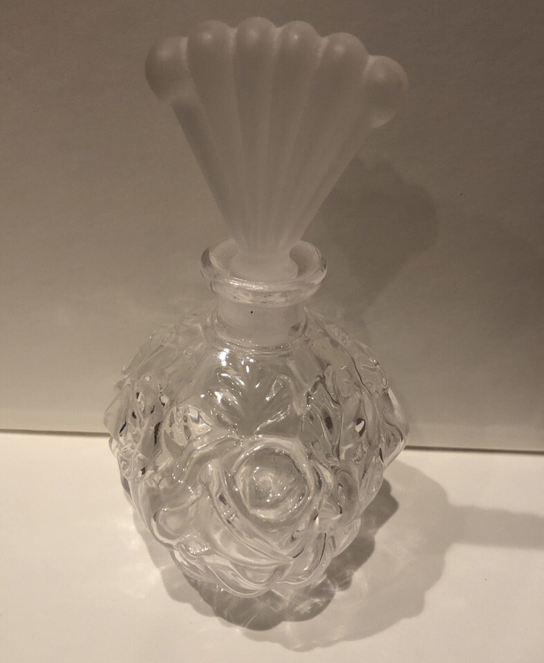 This beautiful glass rose shaped perfume bottle is a must-have for any collector of decorative glassware. Its unique design and frosted stopper make it a charming addition to any vanity or dresser. Perfect for storing your favorite perfumes or as a decorative piece, this bottle is sure to catch the eye of anyone who sees it.