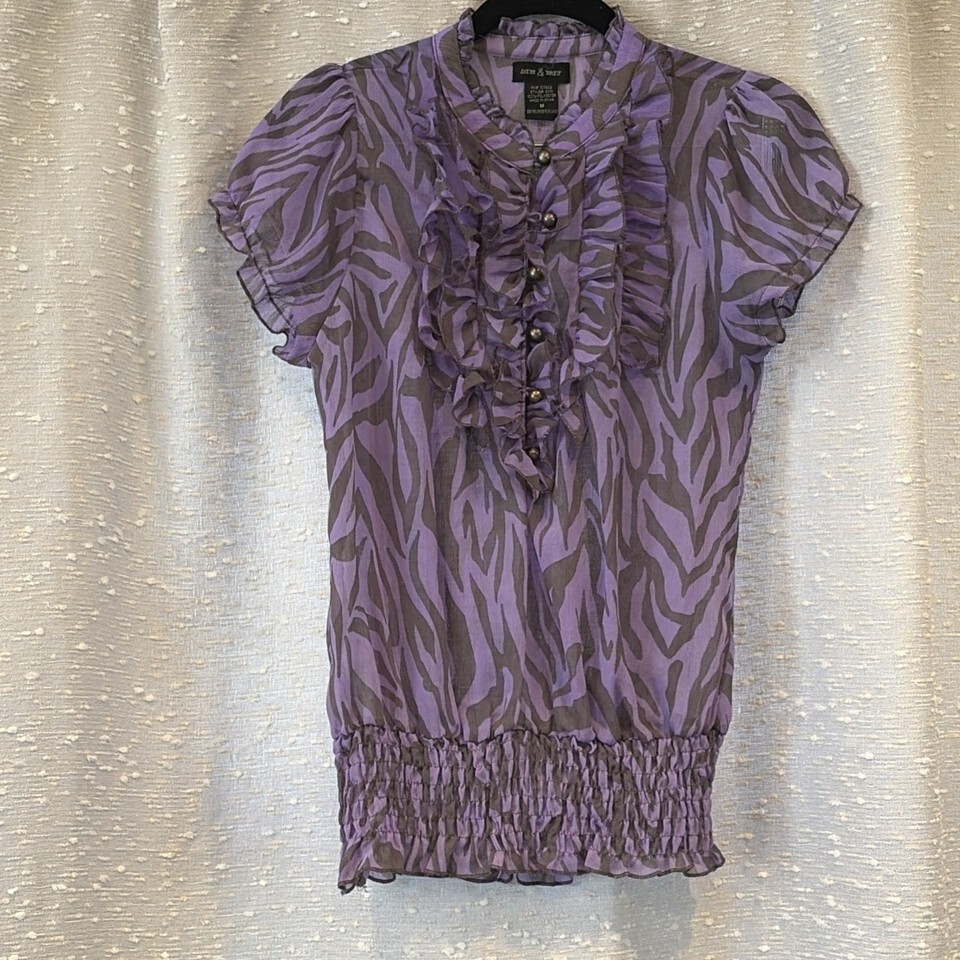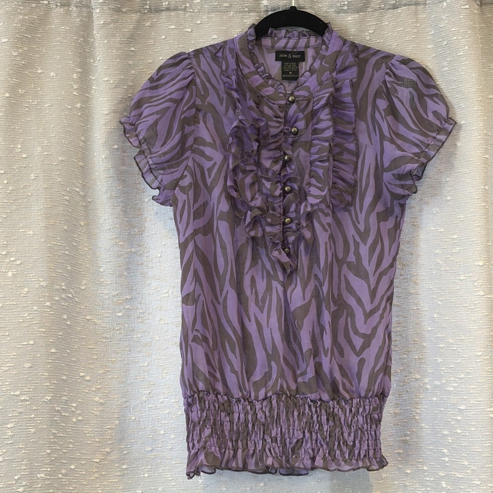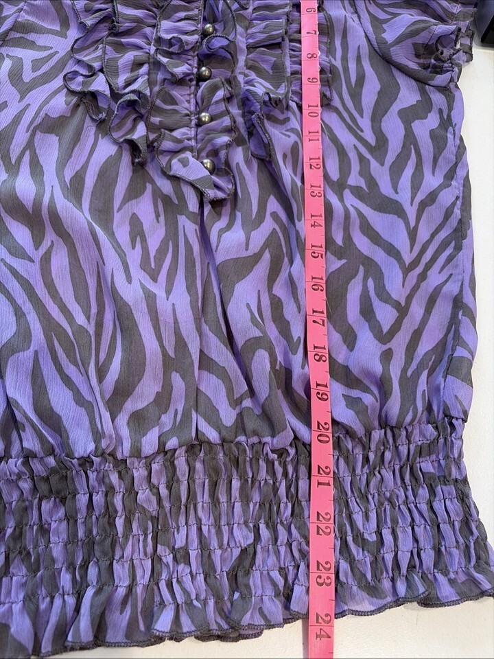 Y2K Sami & Max Purple Zebra Print Sheer Ruffle Blouse Puff Sleeve Size M