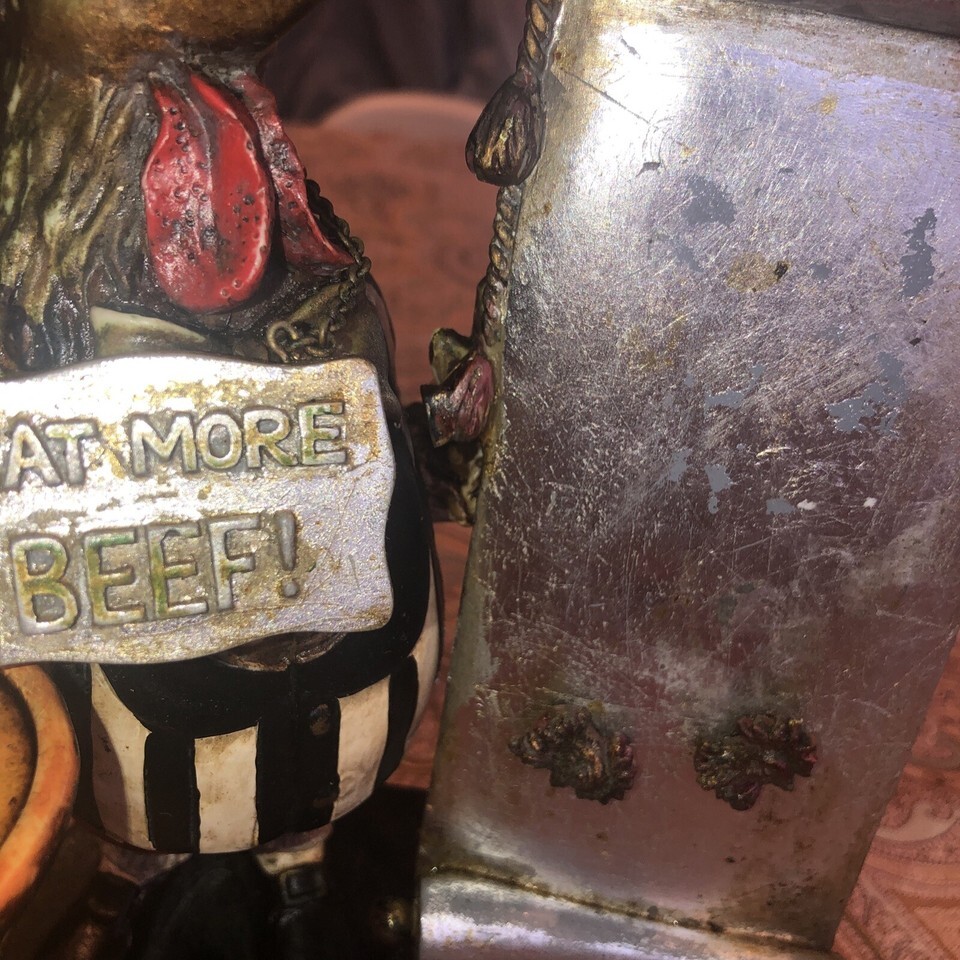 The Chicken Rooster Butler with Tray small statue is a charming kitchen decor piece that adds a touch of farm and countryside flair to any space. This unique statue features a chicken acting as a butler, complete with a tray to serve up some "Eat More Beef" signs. Perfect for chicken lovers or those looking to add a whimsical touch to their kitchen decor, this statue is a delightful collectible item that will surely be a conversation starter.