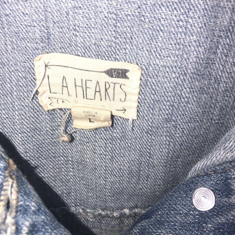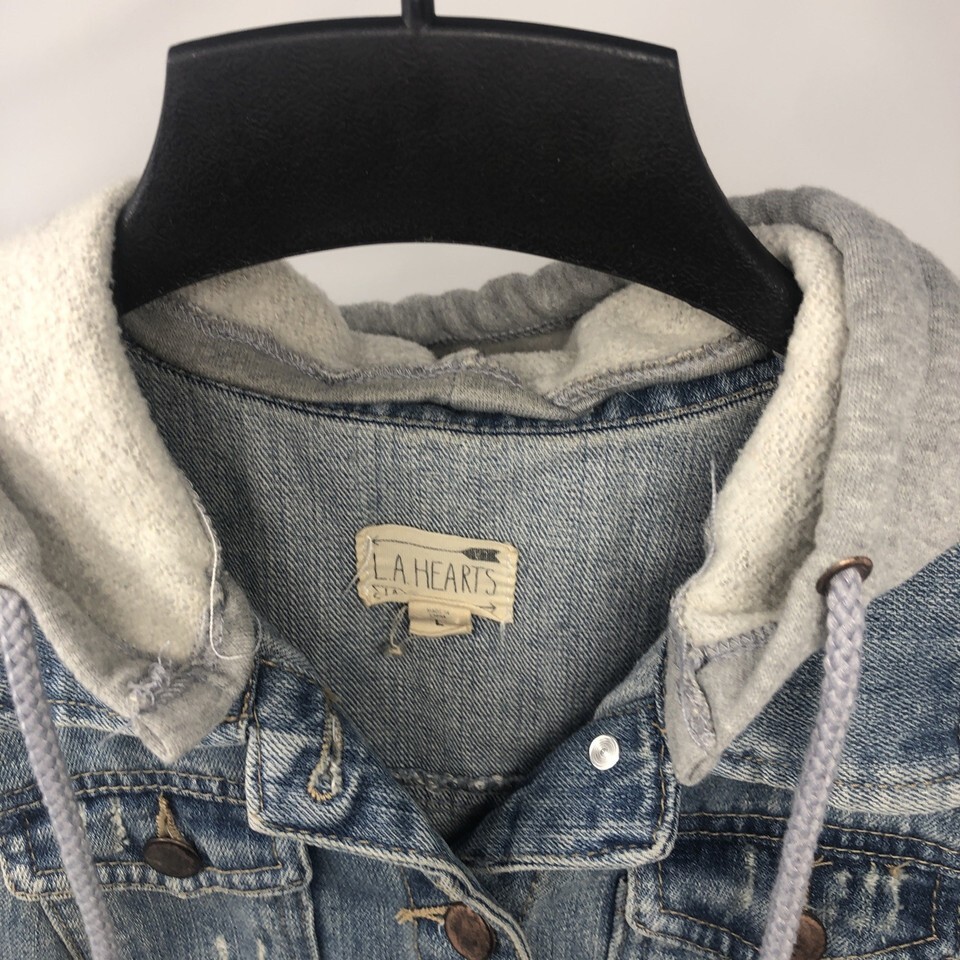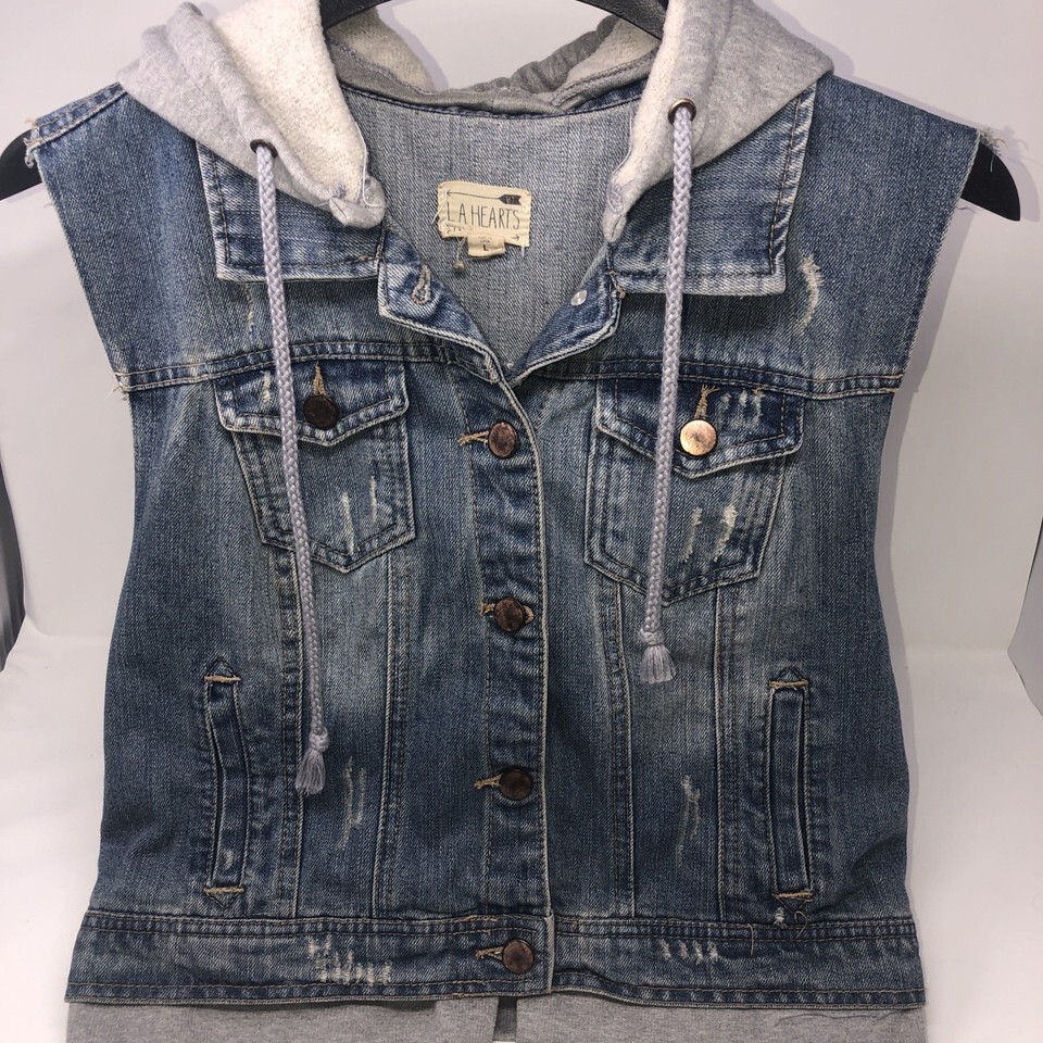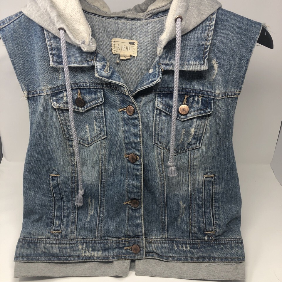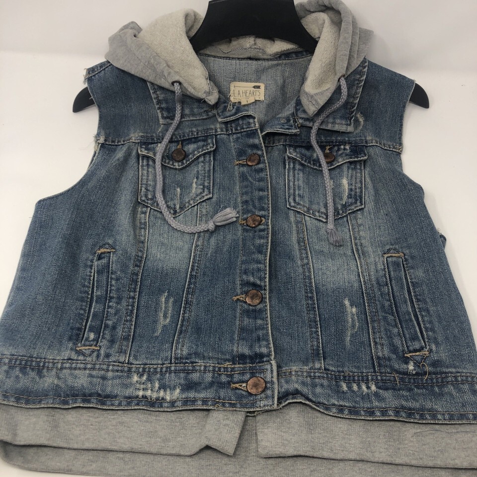 The LA Hearts Vest is a stylish and trendy addition to any woman's wardrobe. This blue denim button-up vest features a hood, perfect for those cooler days. The vest's heart-themed design adds a touch of femininity to the overall look, making it a versatile piece that can be dressed up or down. Made from denim fabric, this vest is not only fashionable but also durable, ensuring it will be a staple in your closet for years to come.