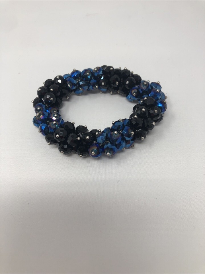 Stretch Bracelet Faceted Glass Beads Black & Blue Tone Blue Hues Sparkle