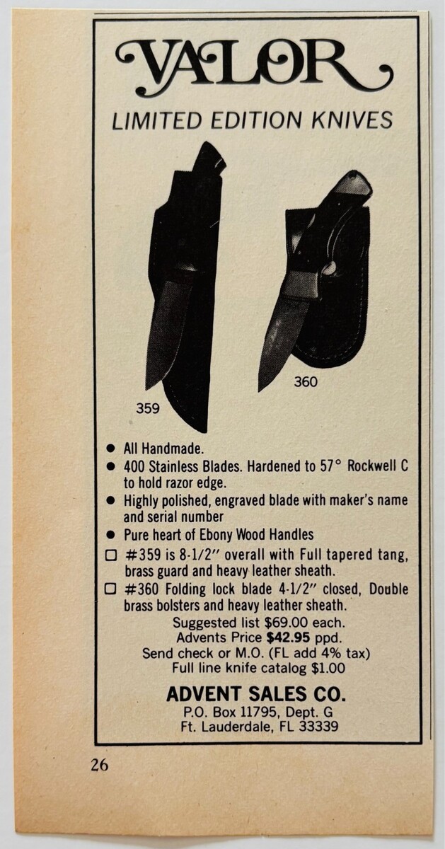 1981 Valor Limited Edition Knives Advertisement Advent Sales Vintage F15Y