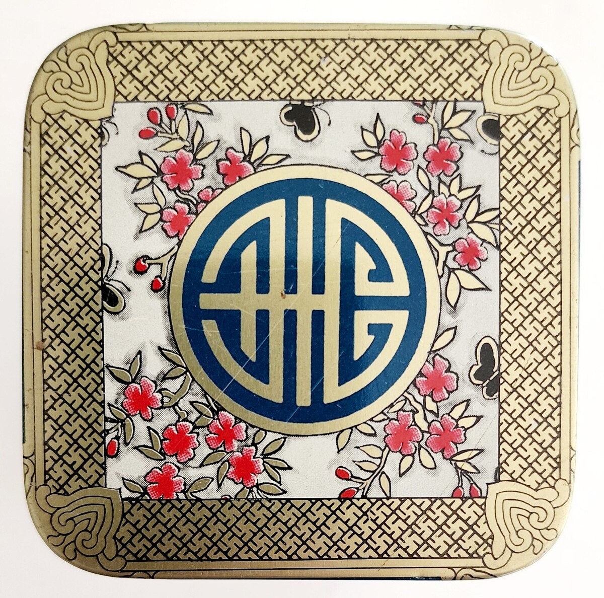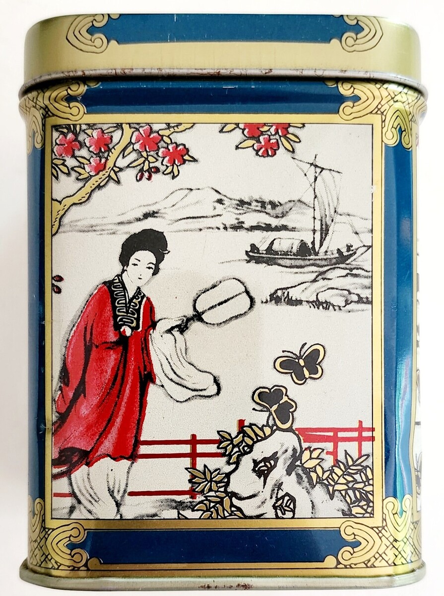 1970s Tea Tin China Pagoda Fisherman Butterflies Vintage Collectible C96