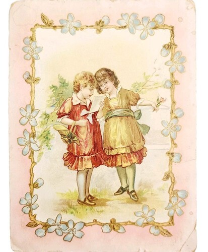 C1900s Victorian Trade Card 2 Girlfriends Read Love Letter Flowers Ephemera E83A