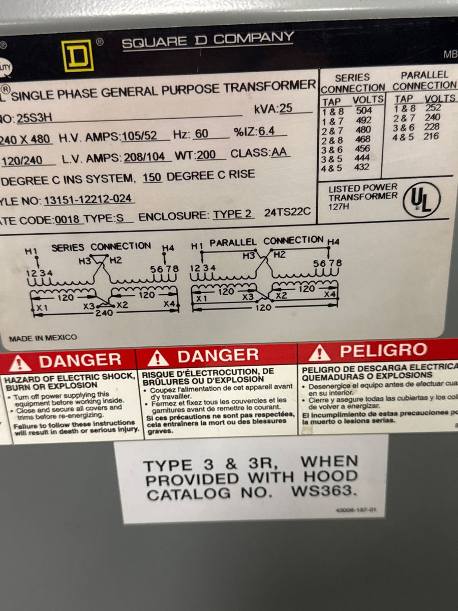 Square D 25S3H Single-Phase Transformer, and 50 similar items