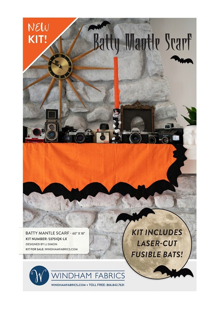 Windham Fabrics Batty Mantle Scarf Quilt Kit 60inx18in. Batty Mantle Scarf. Great as a fireplace mantle scarf or a festive table runner. Pattern Designed by LJ Simon. Quilt Kit, 100 Percent Cotton. Kit includes: fabric, (10) Laser-cut fusible bats, pattern and backing. Kit Number: 53751QK-LX. Finished Size: 60 inches x 18 inches. CHK-53751QK-X
