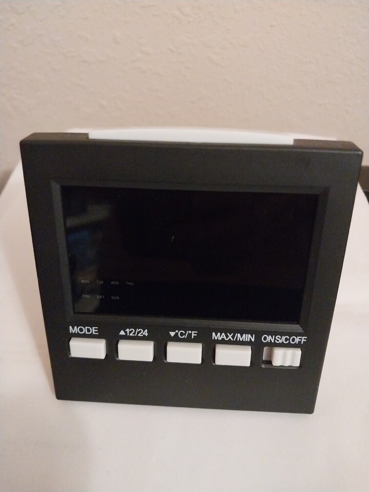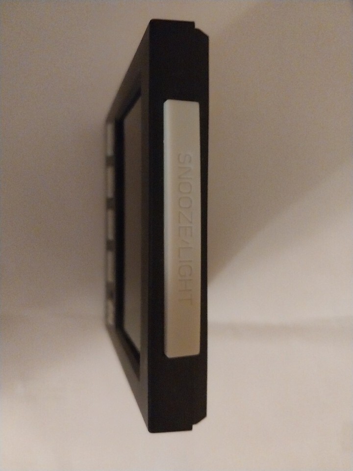 Wake up on time with this lightweight and multifunctional alarm clock. With its digital display, you can easily tell the time and date without any hassle. This clock runs on 2 AAA batteries and has features like snooze alarm, temperature display, and 31-day calendar. Perfect for travel, this battery-operated alarm clock is compact and easy to carry around. Its black color adds to its sleek design. It's 3 5/8" wide, 4" tall and 1 1/2" deep at the bottom. Barely used with no scratches or damage.
